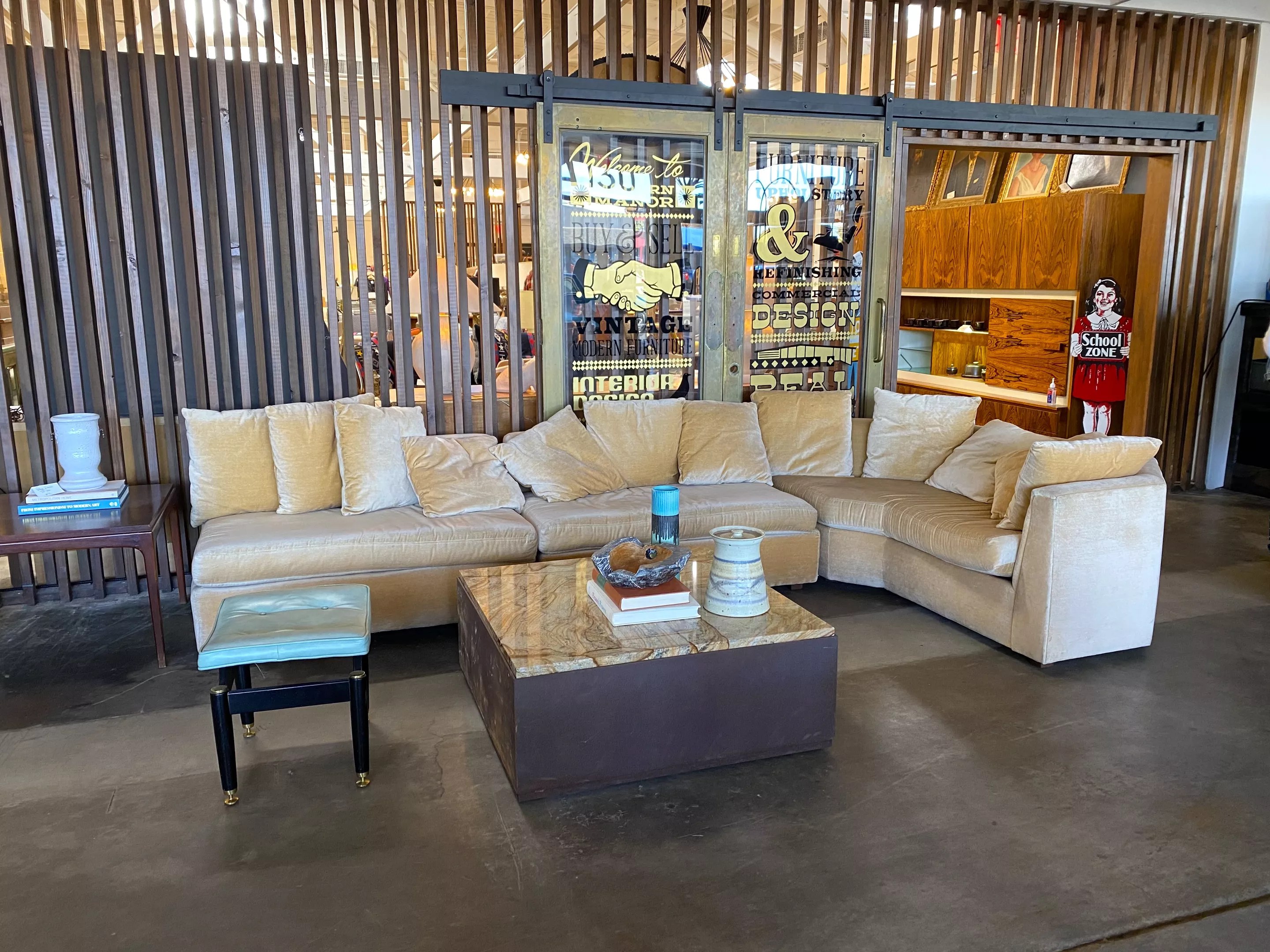 The wood-fired eatery, bar, and cafe sits at the front of mid-century modern furniture dealer Modern Manor – right next to the neighborhood’s entry sign.