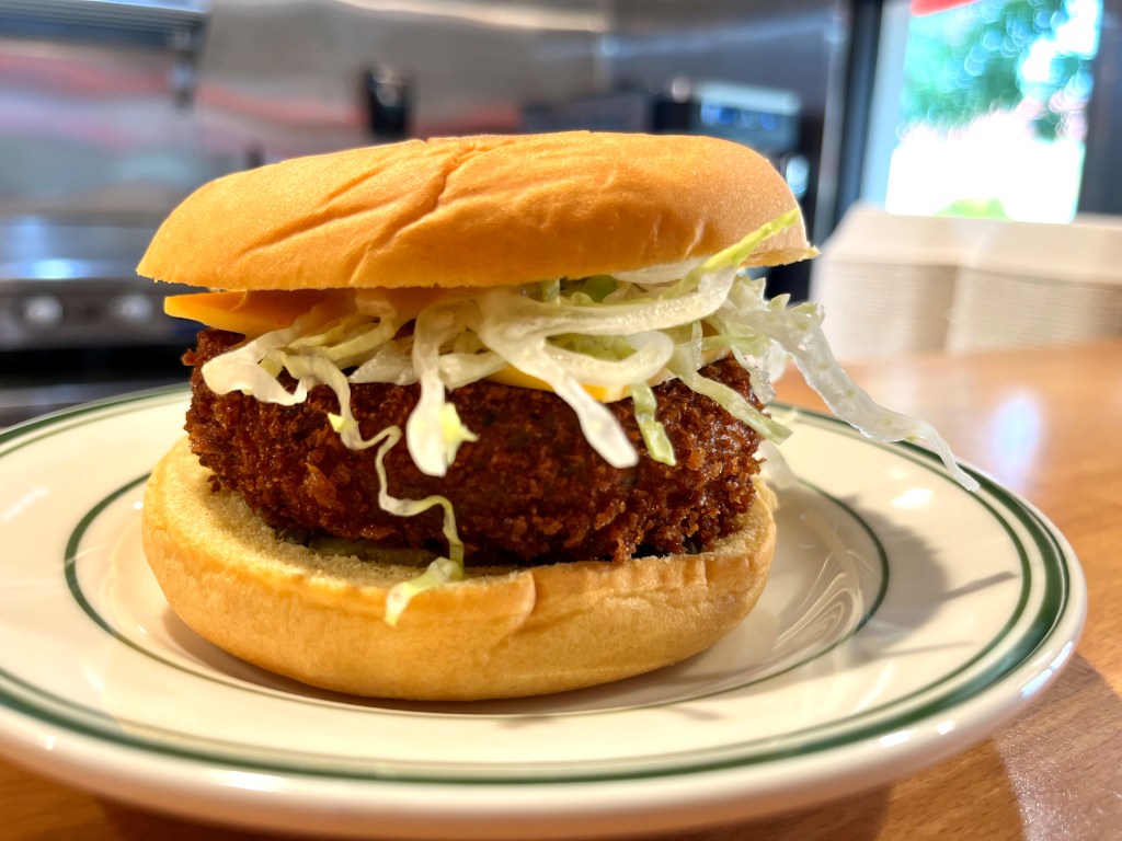 Before it’s fried, each patty gets dredged in a panko and parsley mixture and is cooked to order. Finally, deep fried until a picturesque golden brown, the patties are then placed on a potato bun with pickles, shredded lettuce and a cold slice of American cheese. It’s dressed with a housemade honey mustard that incorporates Japanese Kewpie mayo, which brings tang and umami to the party.