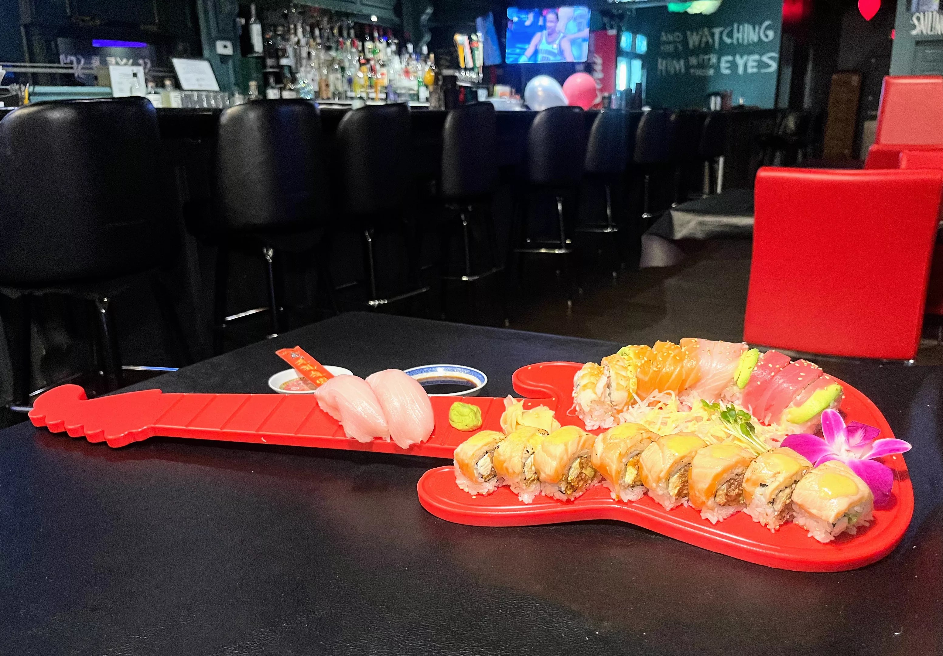 Another crowd-pleaser is the rainbow roll, layered with tuna, yellowtail, salmon, and shrimp, shaped into a perfect cylinder and served on a red guitar-shaped platter. It’s garnished with daikon radish, Brussels sprouts, ginger, wasabi and an edible orchid for that extra visual flair.