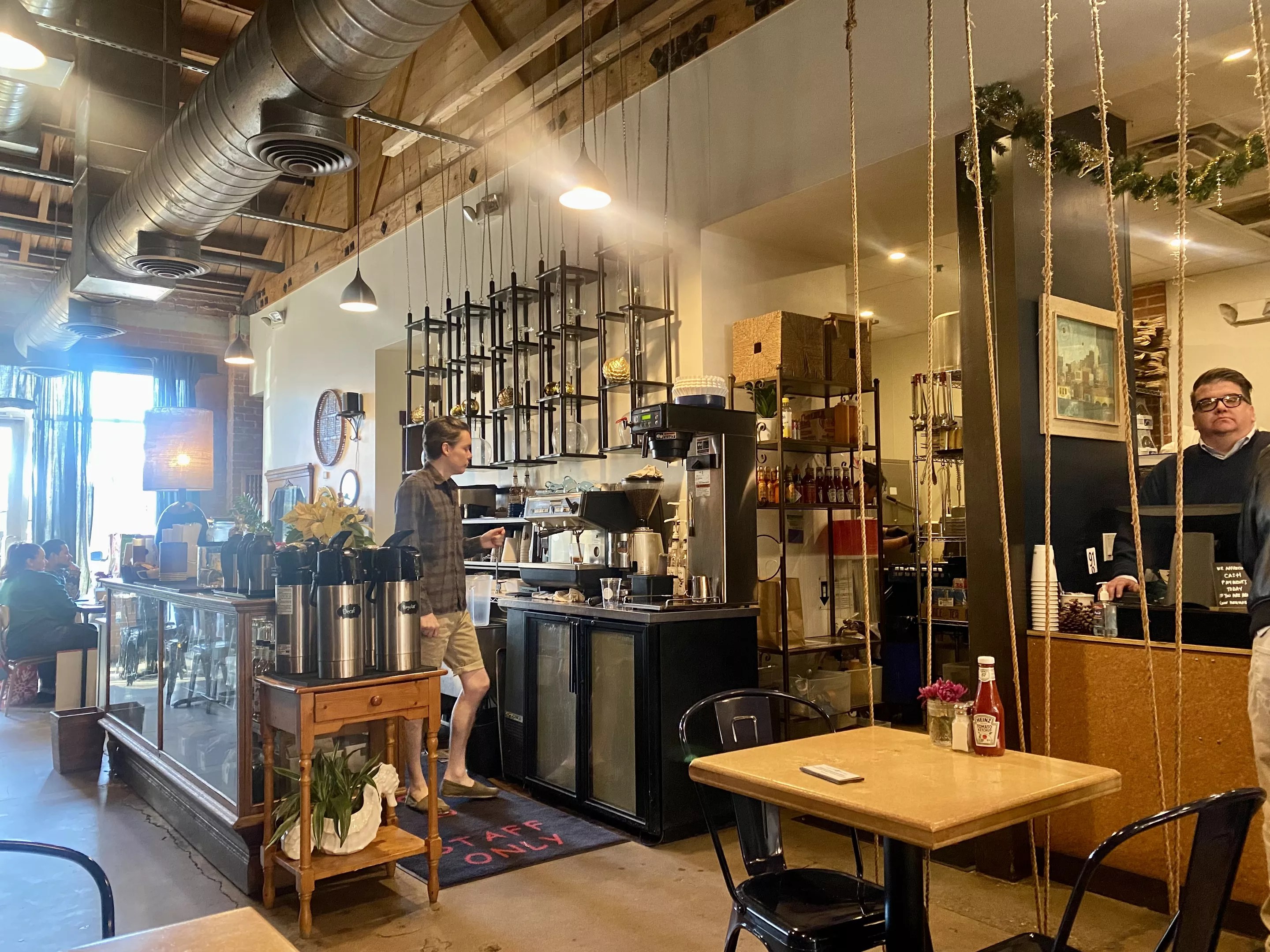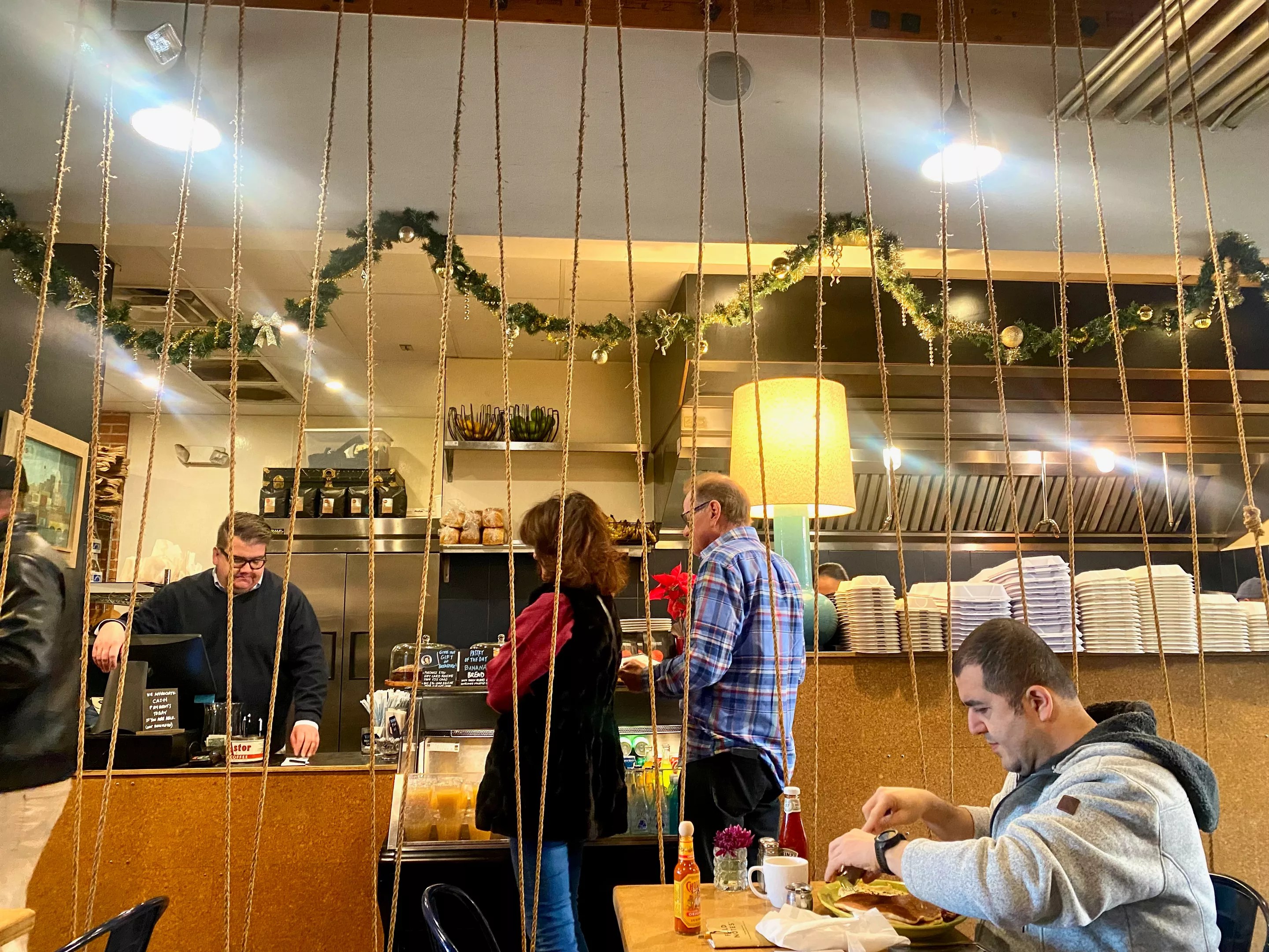 The neighborhood eatery opened in 2012. Vertical ropes separate the order counter from the dining area and the sun seeps through large windows, reflecting off wooden tables. Baked goods including orange cranberry and chocolate chunk muffins are often on display. Families laugh and enjoy their breakfasts as solo diners drizzle syrup over pancakes.