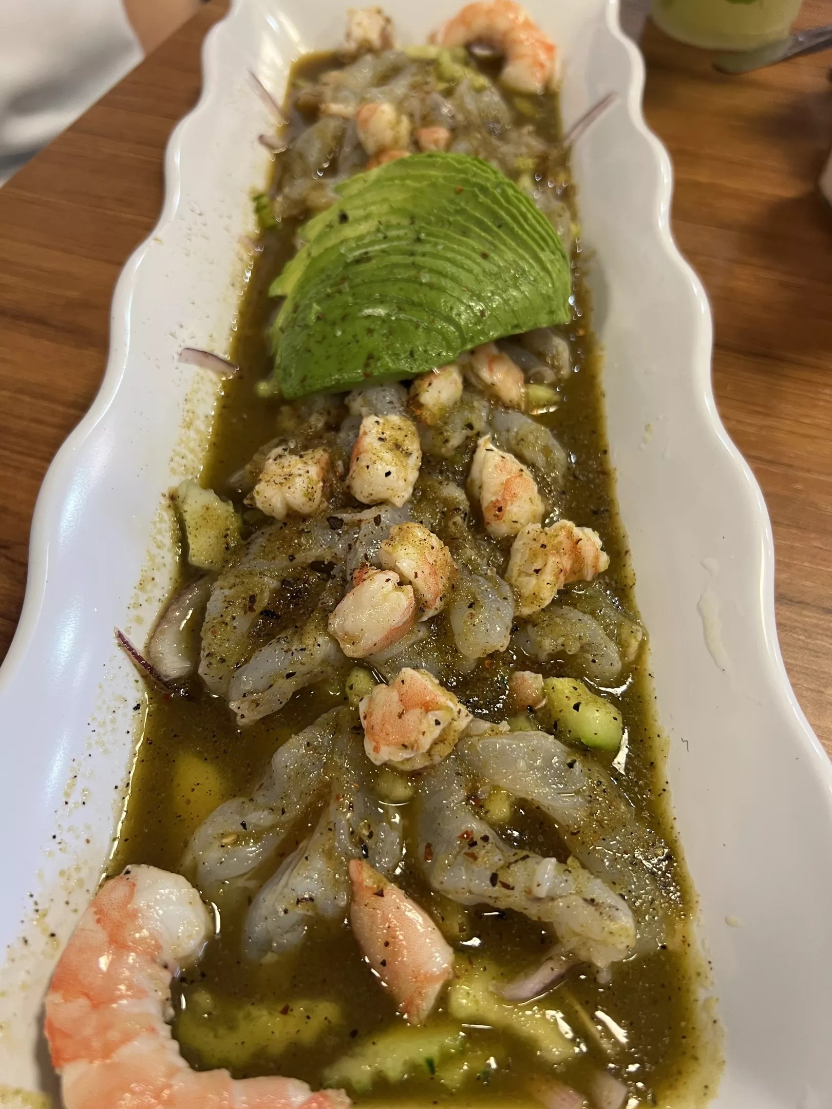 Aguachile is a Mexican dish made of shrimp seasoned with chili peppers, lime juice, salt, cilantro, slices of cucumber, and onion.