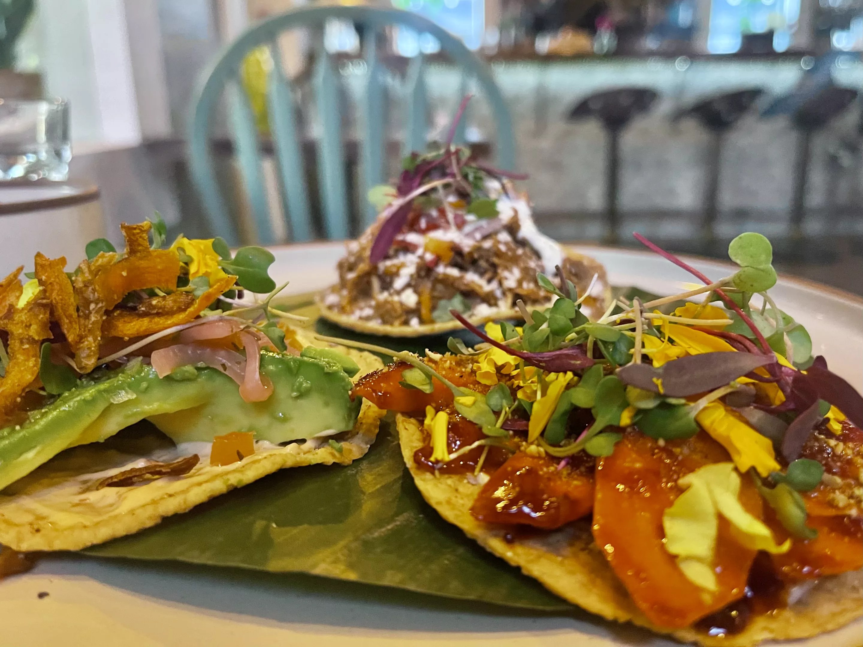 Resting on top of each croquette is a small garnish of edible flower petals and microgreens. The kitchen’s apparent affinity for these toppings is on full display in the Tostada Trio, a plate that brings competition to the tabletop flower arrangements.