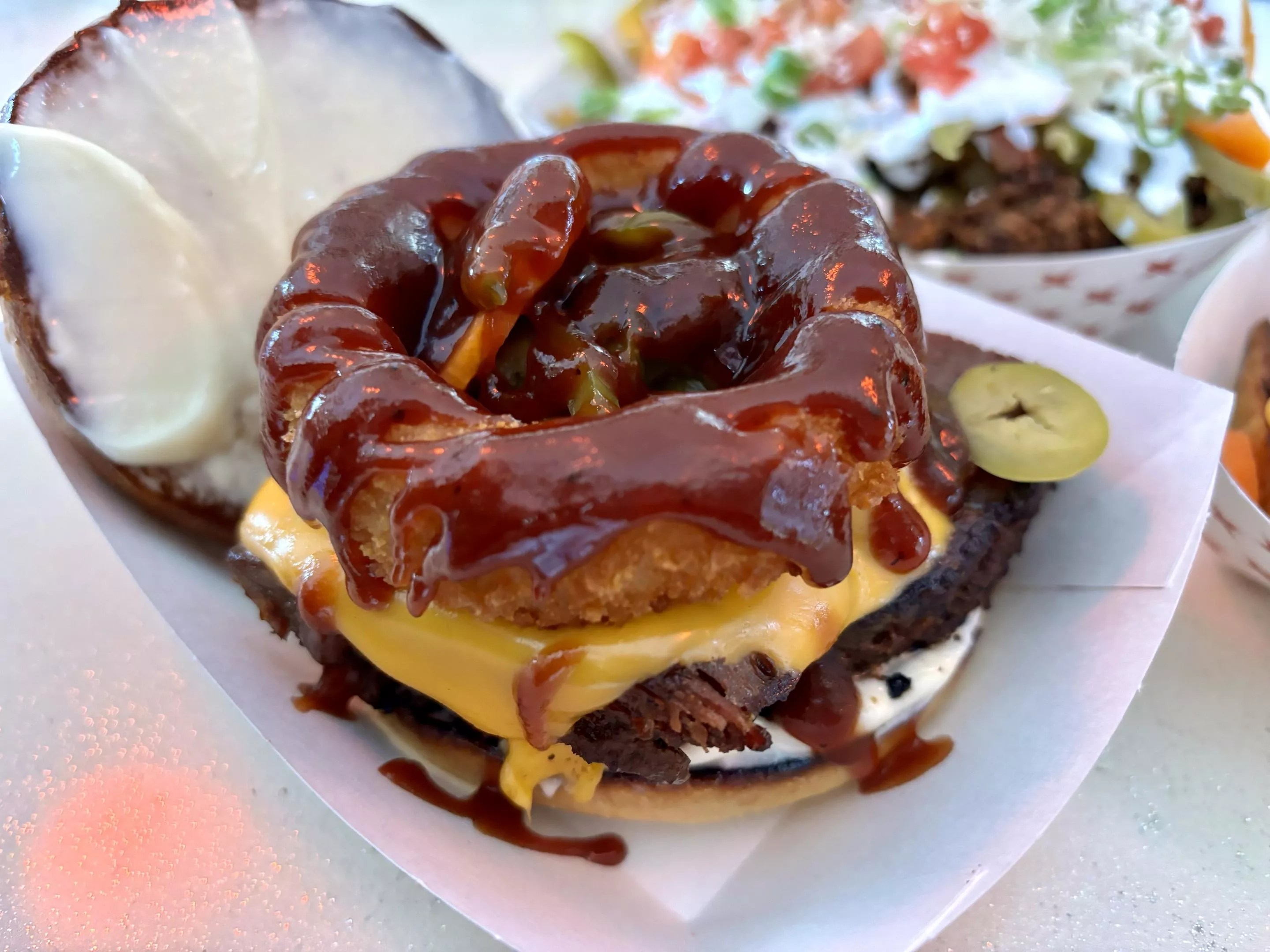 The Big Texan Rodeo is a messy mouthful of brisket, cheese and barbecue sauce.