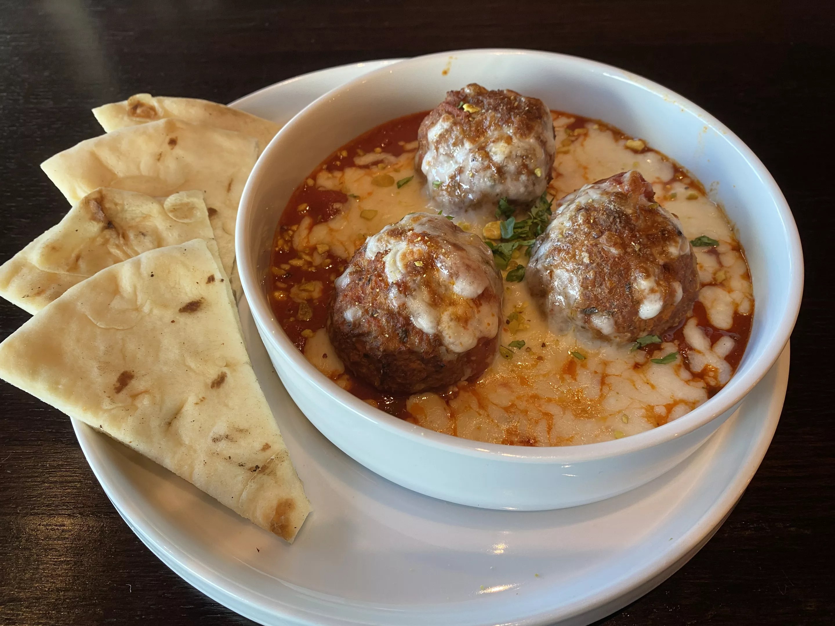 Next up are the lamb meatballs ($15), three golf ball-sized spheres nestled in a slightly spicy tomato sauce with more than a hint of cumin. The dish is topped with gooey mozzarella, pistachios, and a whisper of cilantro, and comes with more of that delicate naan. These are far superior to most boring beef meatballs with marinara.