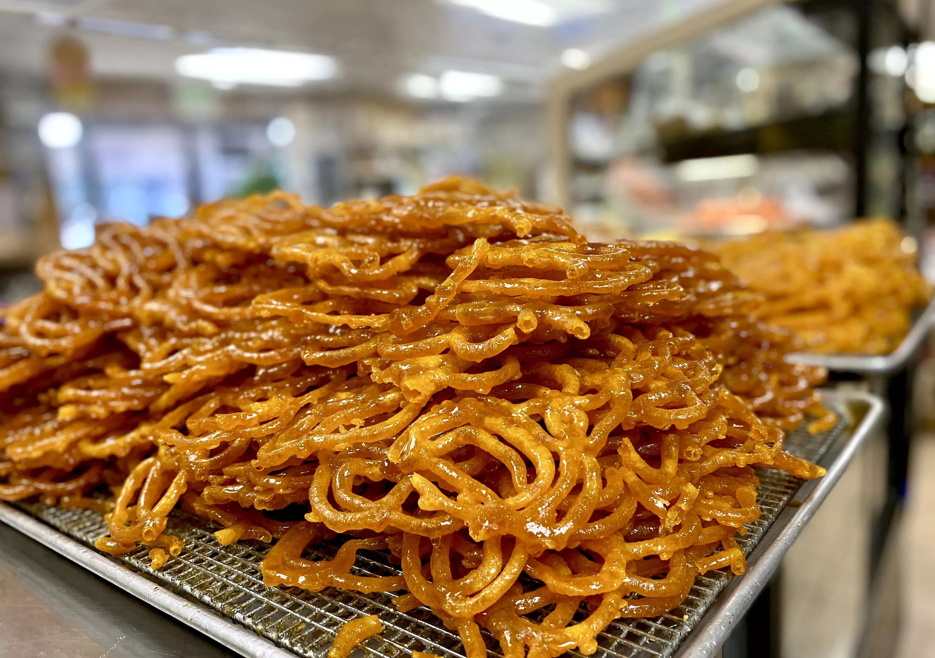 New India Bazaar serves all types of indulgent Indian treats, or mithai – colorful, decorative, melt-in-your-mouth confections like ladoo, jamun, balushahi, and barfi – but Singh’s jalebis take the cake. They are made fresh daily, and on any given day he sells 50 to 100 pounds of the much-loved sweet to both customers and wholesale accounts. That stretches to 300-plus pounds during Diwali.
