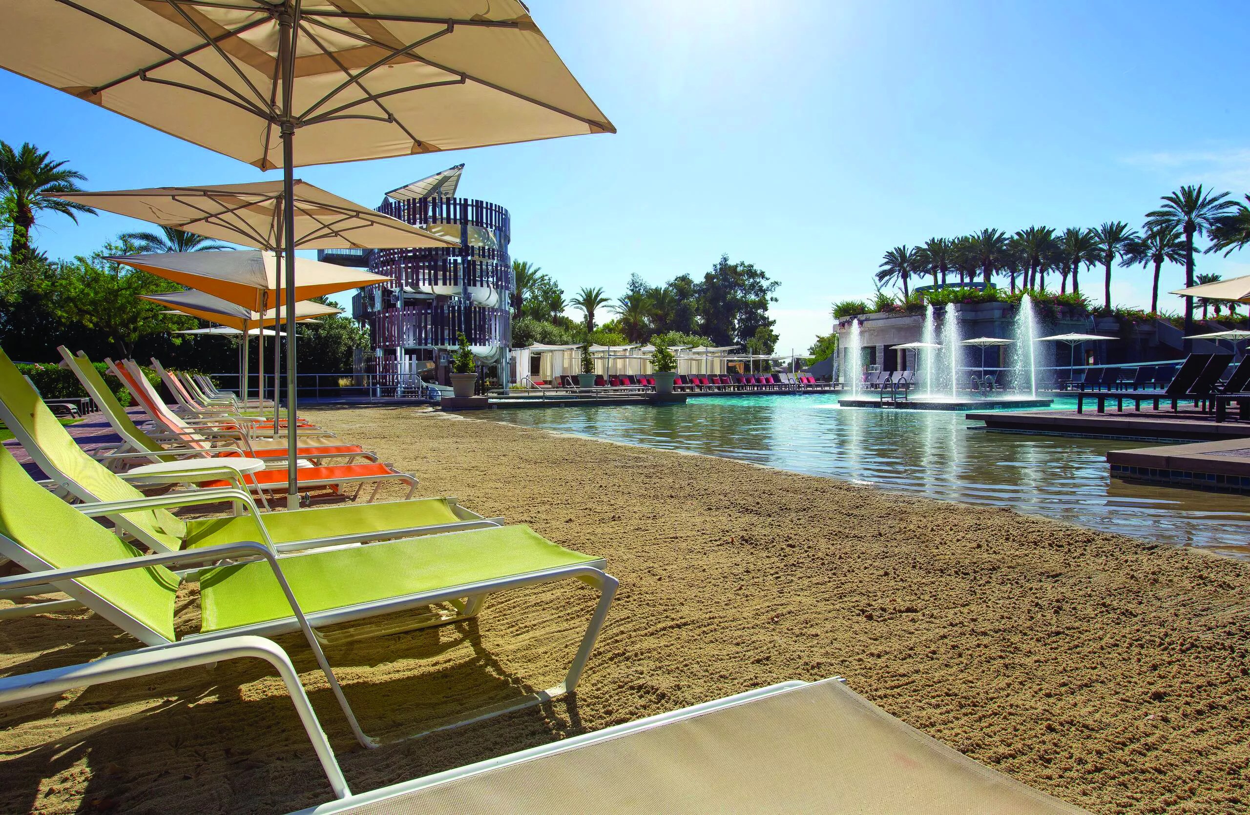 Hey, it’s the Valley of the Sun. You can visit all of these places and live to tell about it (hangover notwithstanding). Start big, on the sandy beach of the Hyatt Regency Scottsdale Resort and Spa at Gainey Ranch (7500 East Doubletree Ranch Road, Scottsdale, 480-444-1234), where instead of cool-decking you’ll wiggle your toes into a manmade sandy beach where waiters circulate, handing out mai tais (but only if you’ve ordered one). Nearby, a more traditional swimming pool is ringed with cabanas and comfy deck chairs, from which one can request a bottle of Champagne, a Dewar’s on the rocks, and even nibbles from the bar menu.