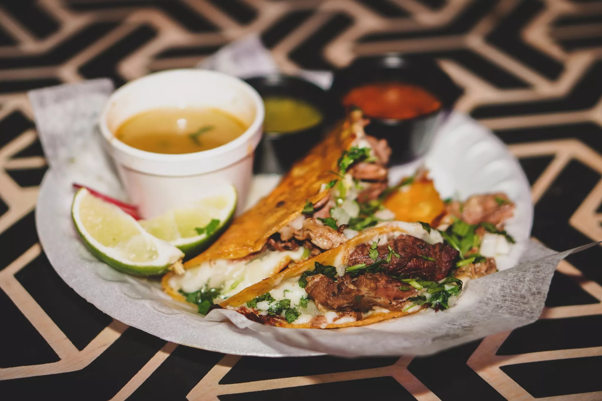 Carrilo’s version of tacos dorados is made with birria and is served with a flavorful cup consomé, salsas and limes.