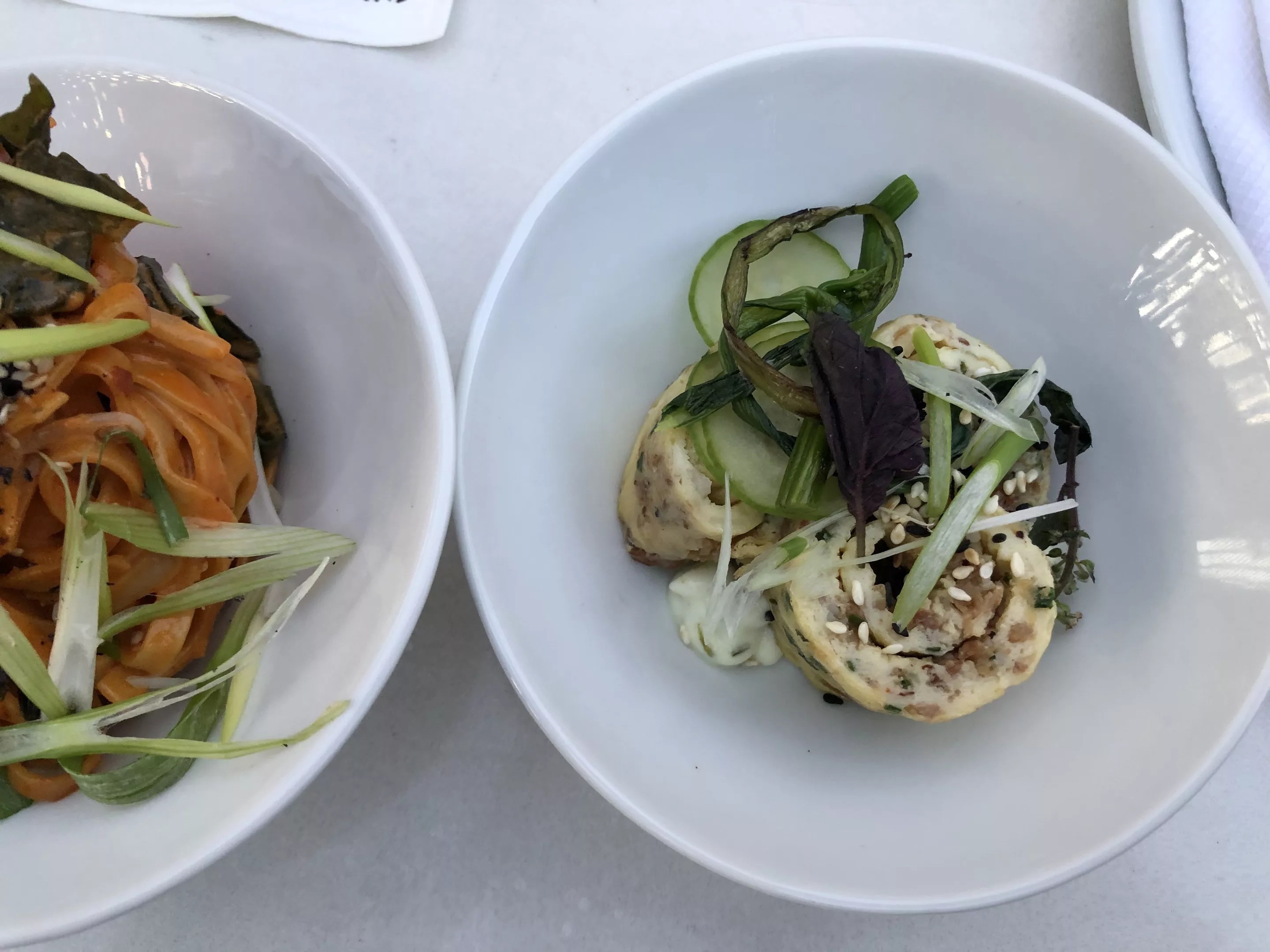 Chile-dialed noodles and “egg rolls,” from the hand of Sacha Levine.