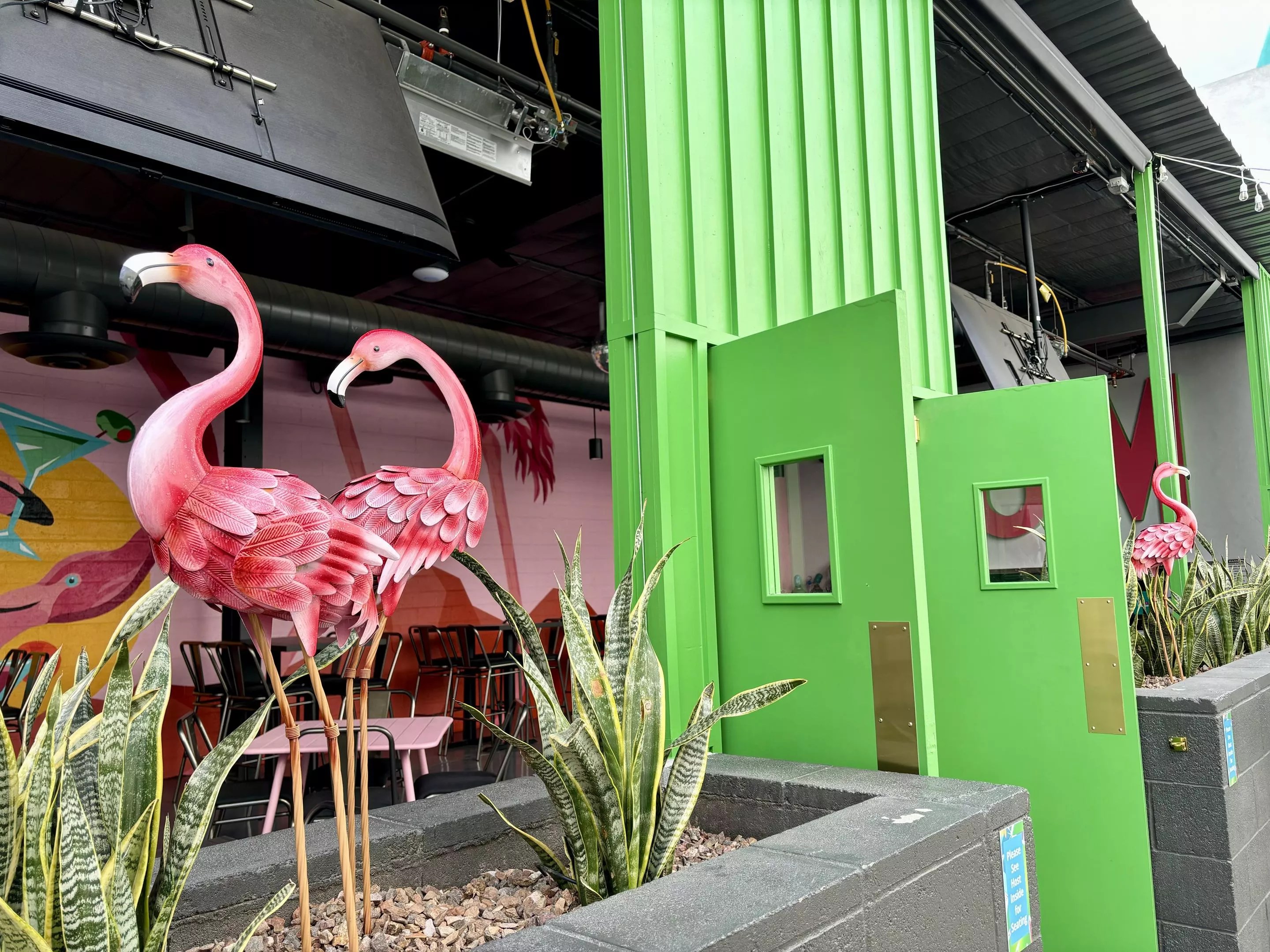 The restaurant and bar’s colorful murals swirl around the walls and are reflected in the pink and orange cocktails. Across from the entryway, a bright green-walled outdoor patio is filled with pink metal flamingos and whirling fans.