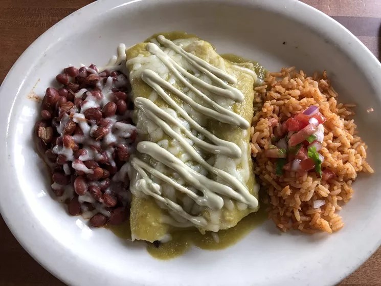 Leo Madrigal packs more than 30 years of kitchen experience into his enchiladas. For his green chile enchiladas, the Mexico City-born chef gives pork the slow-and-low barbacoa treatment. The pork is soft, yielding, and smothered in green chile with the same feel-good molten qualities of the pork itself. Sauce blankets the modest-size corn tortillas neatly, spilling a little onto the beans on one flank, the pico-topped rice on the other. A dramatic tight zigzag of crema crowns the top, adding yet another dimension of pure softness on top of the melted cheese.
