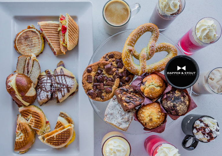 Dapper & Stout is perfect for grabbing your morning espresso and breakfast before hitting the road. You can grab a cold brew or an Americano, or give the Mexican Mocha or the Bowtie (amaretto, dark and white chocolate, espresso, and cream) a try. There are sweet and savory options like the spicy Italian panini (with aioli, provolone, hot capicola, ham, salami, roasted peppers, and pepperoncinis) and the banana Nutella french toast. Light starters like fruit smoothies, protein shakes, oatmeal, and muffins are also available.