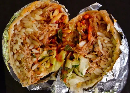 Fusion fare tends to be on shaky ground, particularly in the fast-casual sector. But we have to admit that Gilbert’s Fusion Burrito offers a solid meal, especially at such an affordable price. The fact that there’s a drive-thru window gives the operation all the more appeal. The menu includes creations that range from “Okay, that doesn’t sound too bad” to “Really? That can’t be good.” Consider the Gilbert burrito, which features housemade chicken salad with dried cranberries, almonds, celery, and greens. It’s more wrap than burrito, but we can get behind the idea.