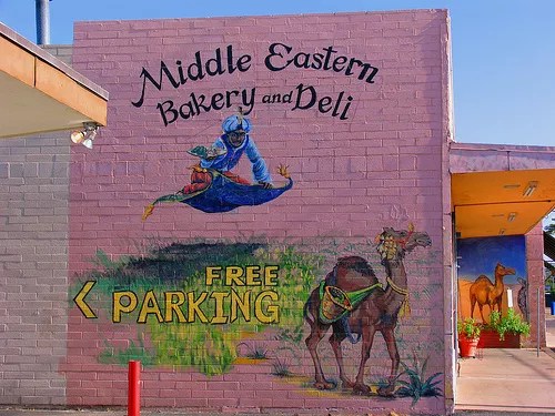 Small Middle Eastern grocery and restaurant that serves terrific lamb kebabs, kibbe, and baba ghanouj, as well as baked treats like baklava and crisp cookies filled with dates. Dining area is limited, but romantic, with a mural of Bethlehem on one wall, and a TV set hanging from the ceiling showing belly dancing. Grocery features everything from Jordan almonds and candy-coated chickpeas to a vast array of spices, and a deli with at least a half-dozen types of olives. Along with the canned and dry goods for sale are religious figures carved from olive wood, and blue glass talismans to ward off the evil eye. A cool little shop, like stepping into another world.
