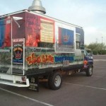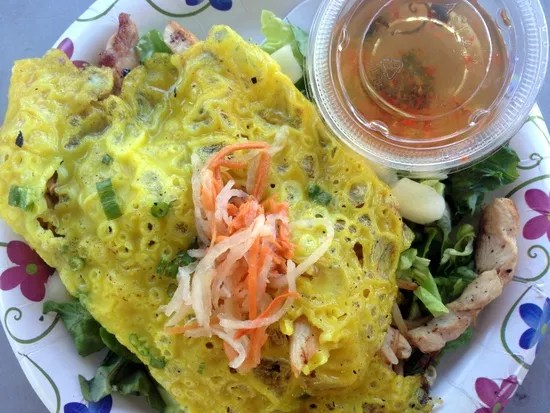 The Great Pho King food truck comes from Mike Baum (front of the “house”) and chef Eddy Pham, who met just a year ago and realized they would need each other to enter — and be successful in — the street food biz. The menu includes two types of Vietnamese noodle soup, or pho, both of which come with rice noodles, meat, sliced onions, and cilantro. The Pho King also serves up other Asian fusion fare such as Vietnamese sandwiches (banh mi), fresh (and refreshing!) spring rolls (goi cuon) and crispy crepes (banh xeo). They also offer two grilled cheese dishe with Gruyere, cheddar, havarti, and Brie. Each of the items ranges from $4 to $8.50, with the most expensive option being the crispy crepes.