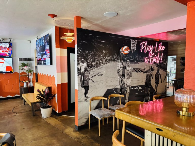 Title 9 Sports Grill is packed with homages to women in sports. From the Diana Turasi photo wall to photos of famous women in sports journalism, it is evident that co-founders Kat Moore and Audrey Corley worked hard to intentionally carve out a space they felt was missing in Phoenix. The goal? For young girls to see themselves represented in women’s sports. Opening week summoned excited patrons who had their own reasons for visiting: a father who is also a coach for a girls high school sports team, an MLB player agent who is a woman and nearby residents eager to check out the new sports bar. Title 9 doesn’t call itself an LGBTQ+ bar, but we did notice interior design choices potentially selected to mirror the colors of the lesbian pride flag — a nice touch for a bar tucked into the Melrose district: Phoenix’s esteemed “gayborhood.”