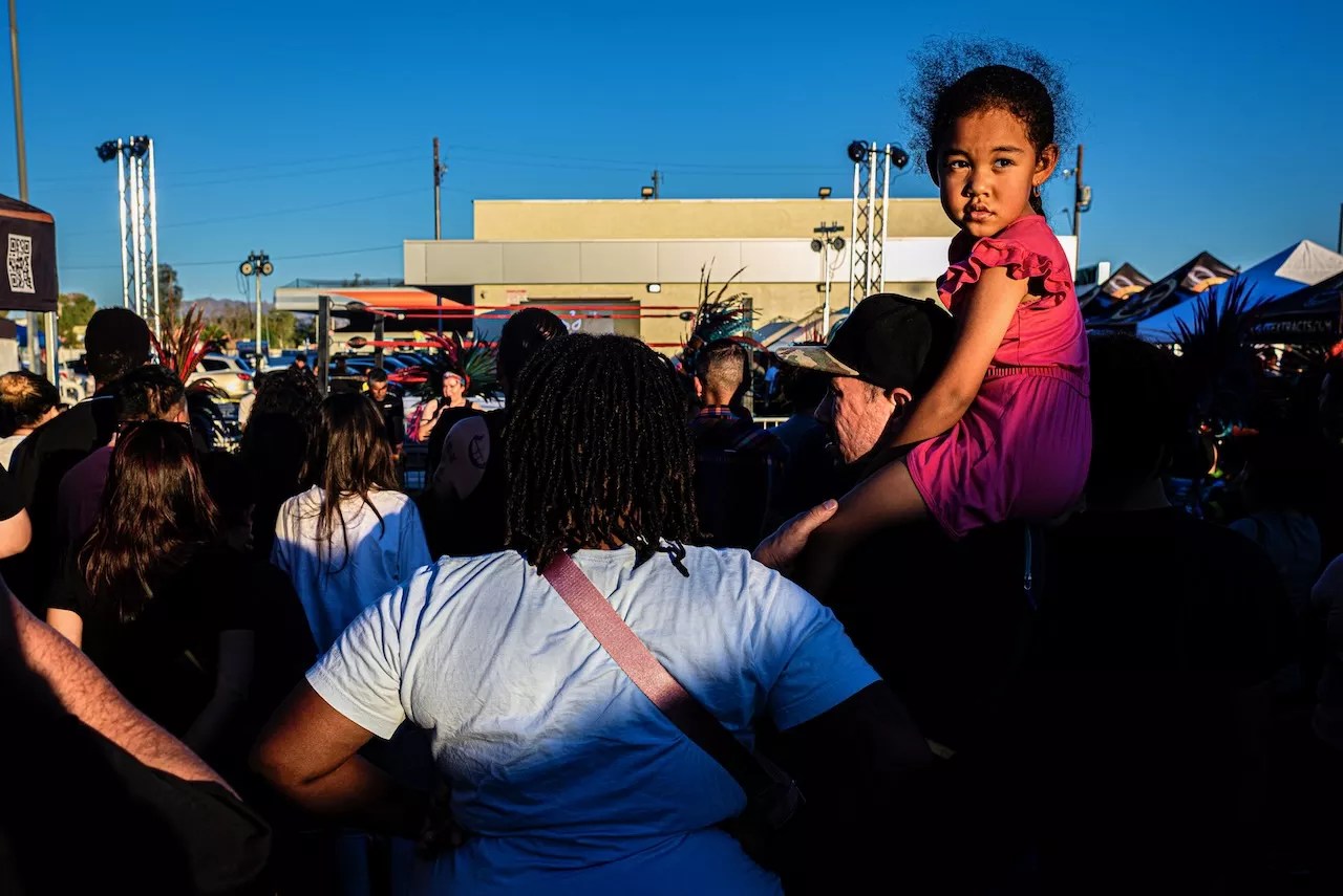 A child sits on the shoulders of a family member to view the Azteca dancers.