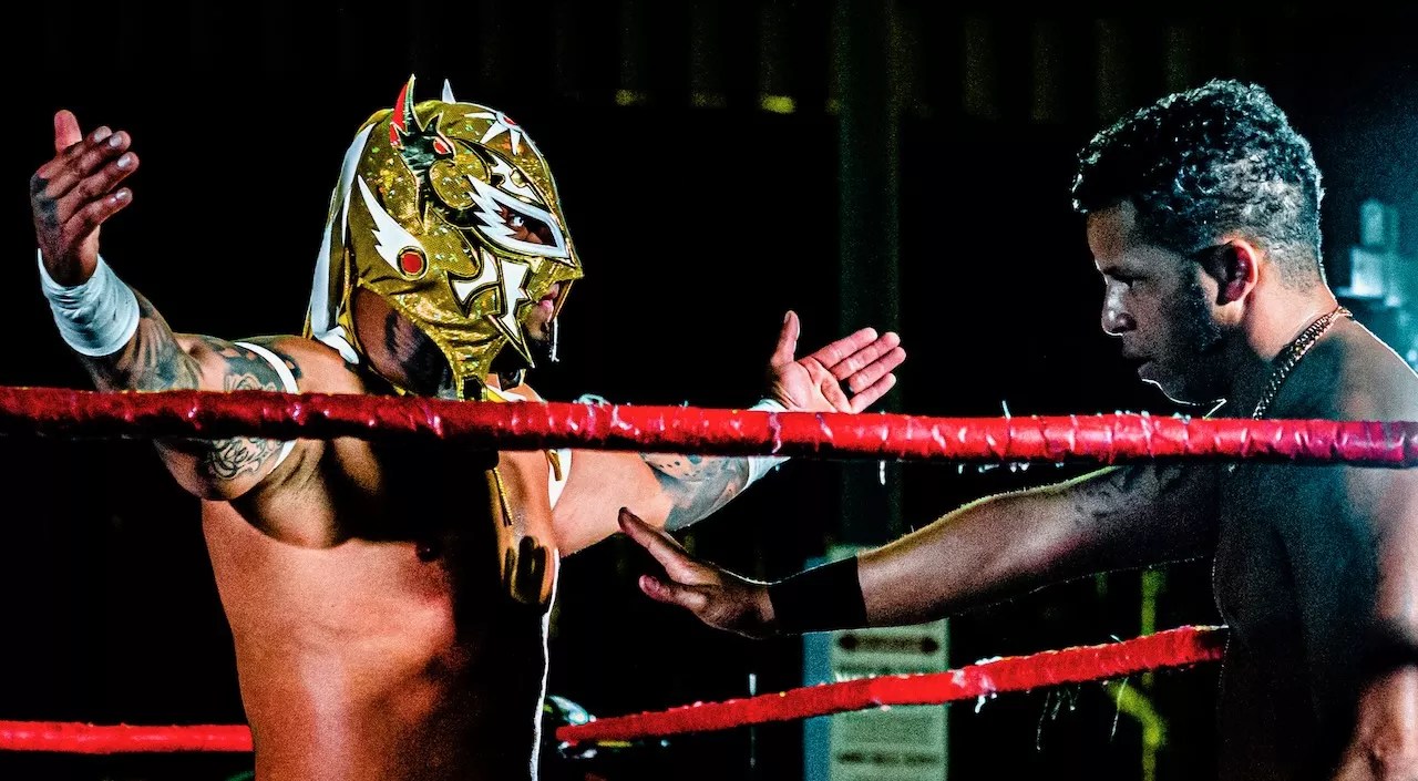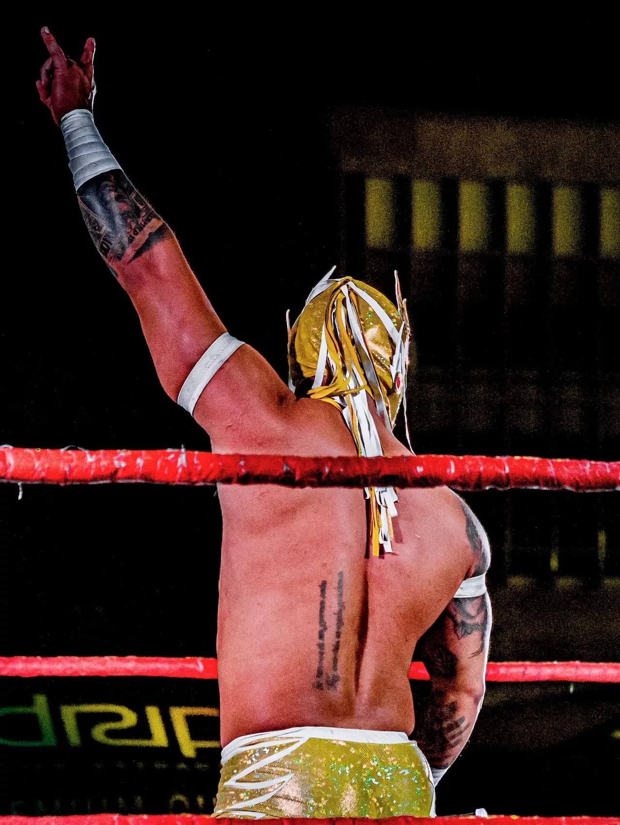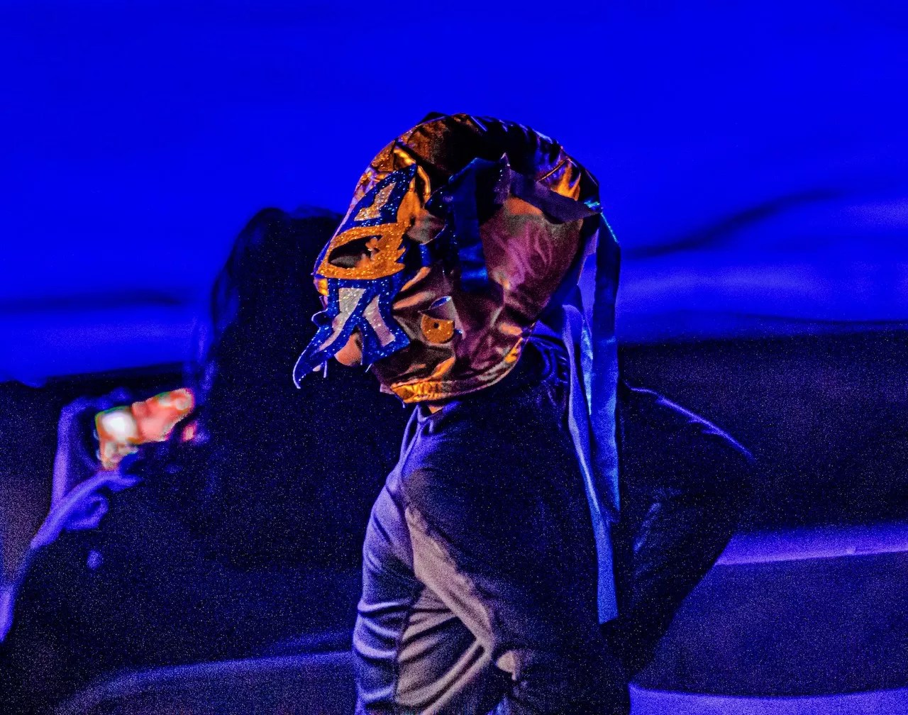 A child wearing a lucha libre mask waits for a wrestling match to start.