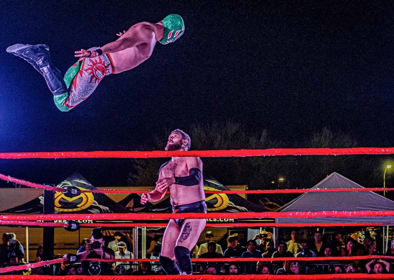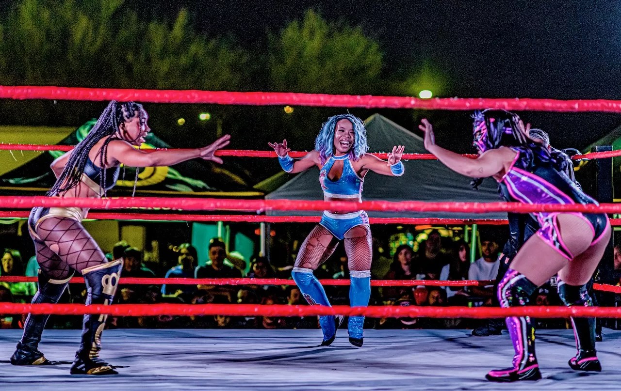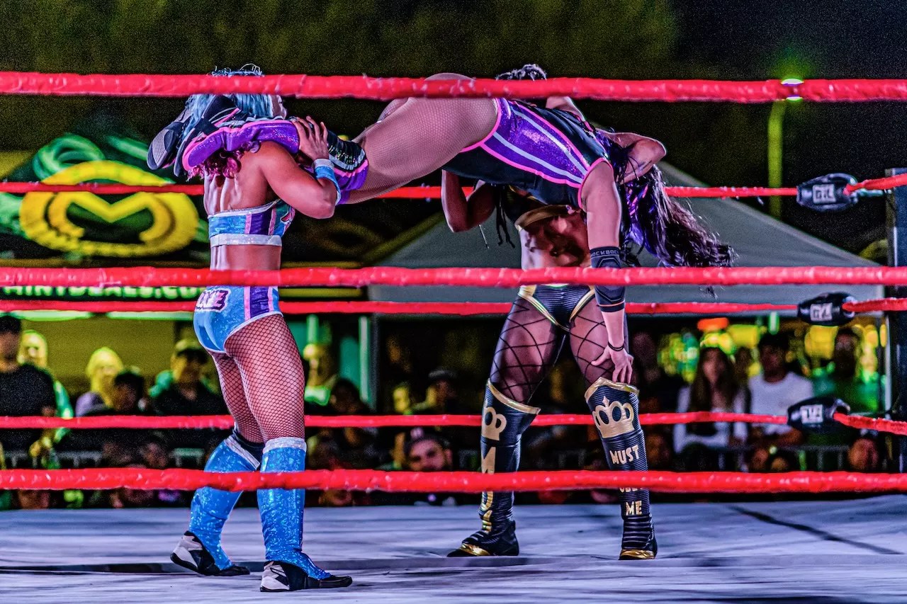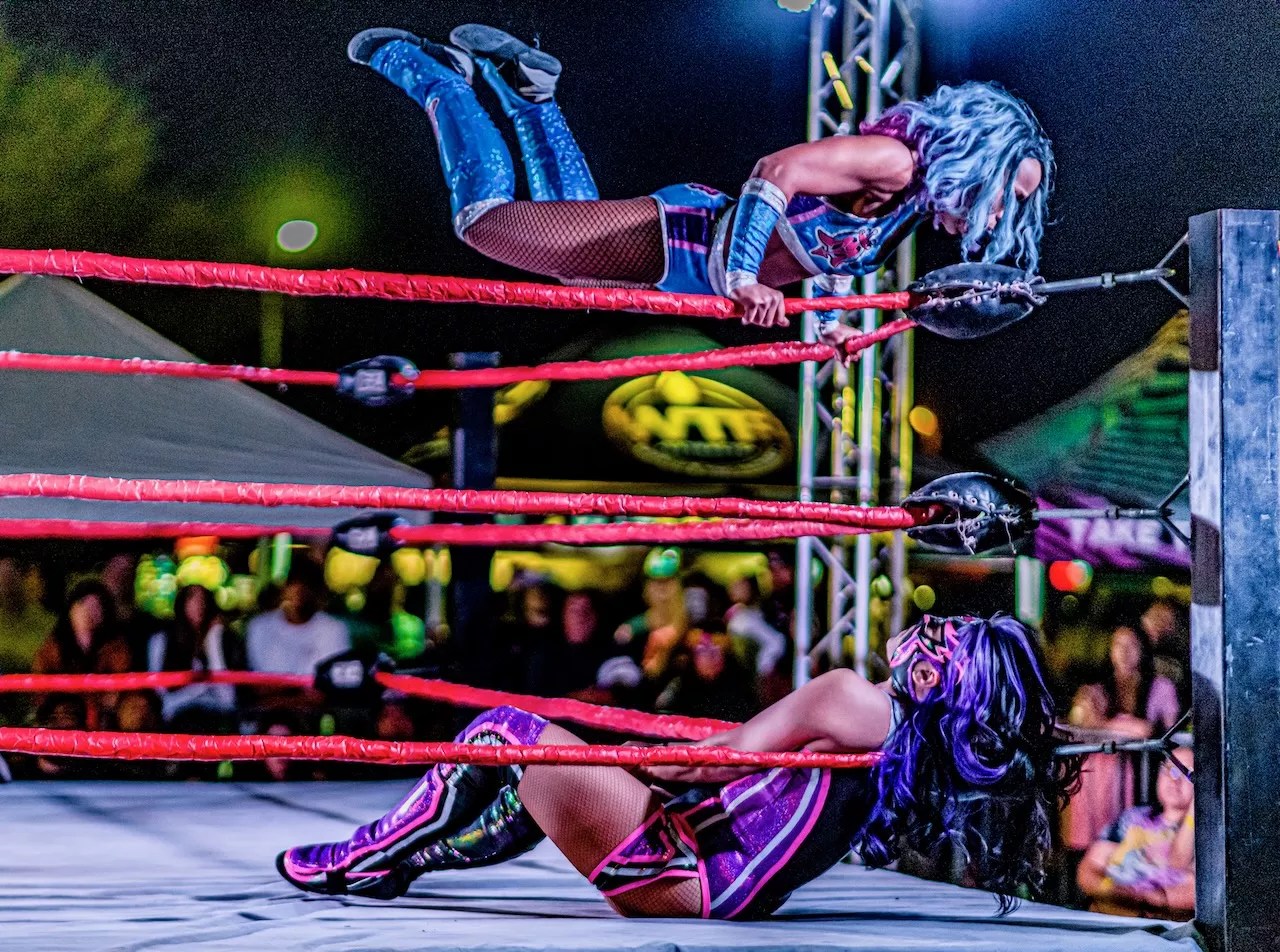 A wrestler performs a flying kick on her opponent during the first wrestling match.