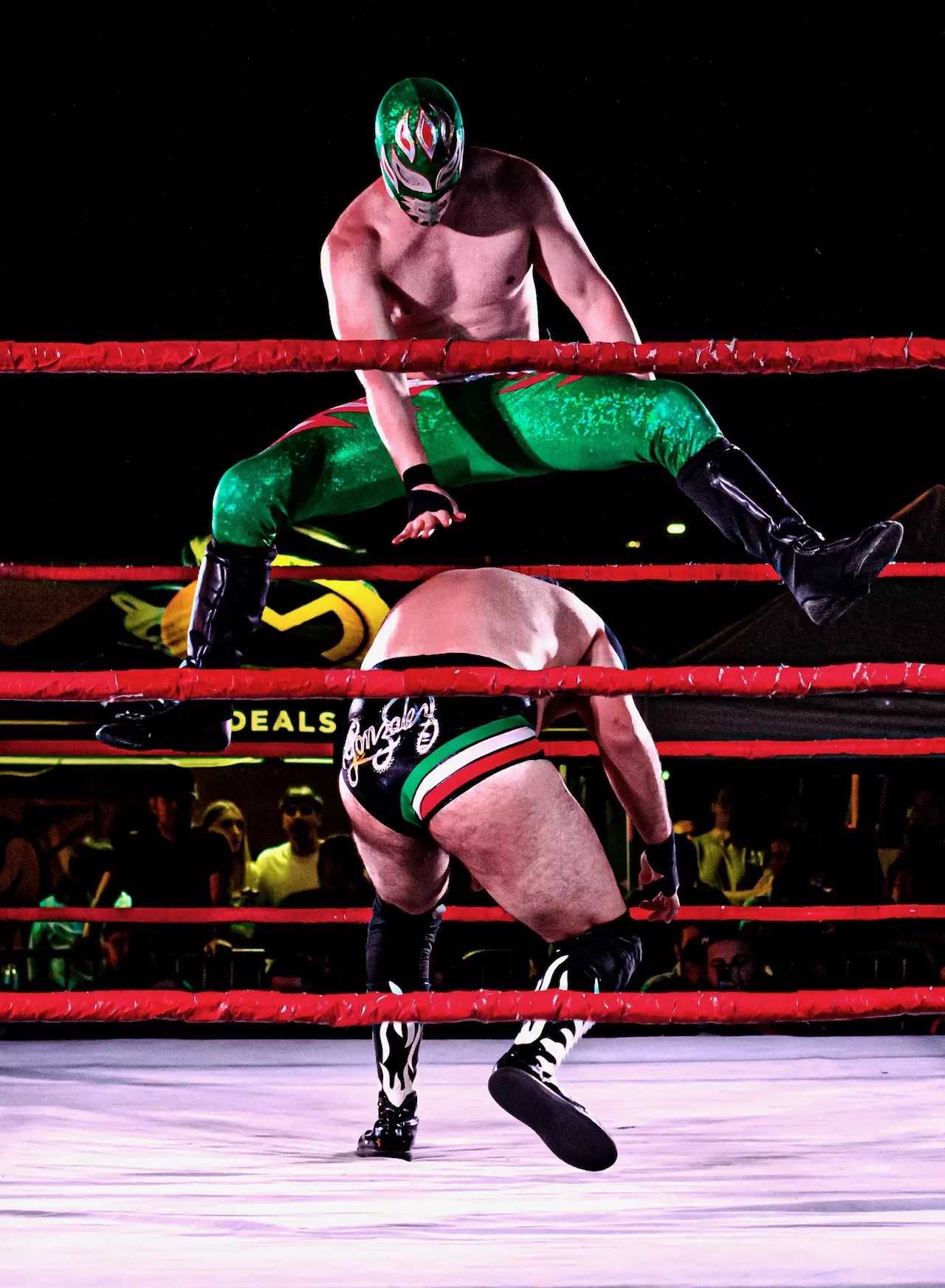 A wrestler jumps from the top rope onto his opponent during the second match.