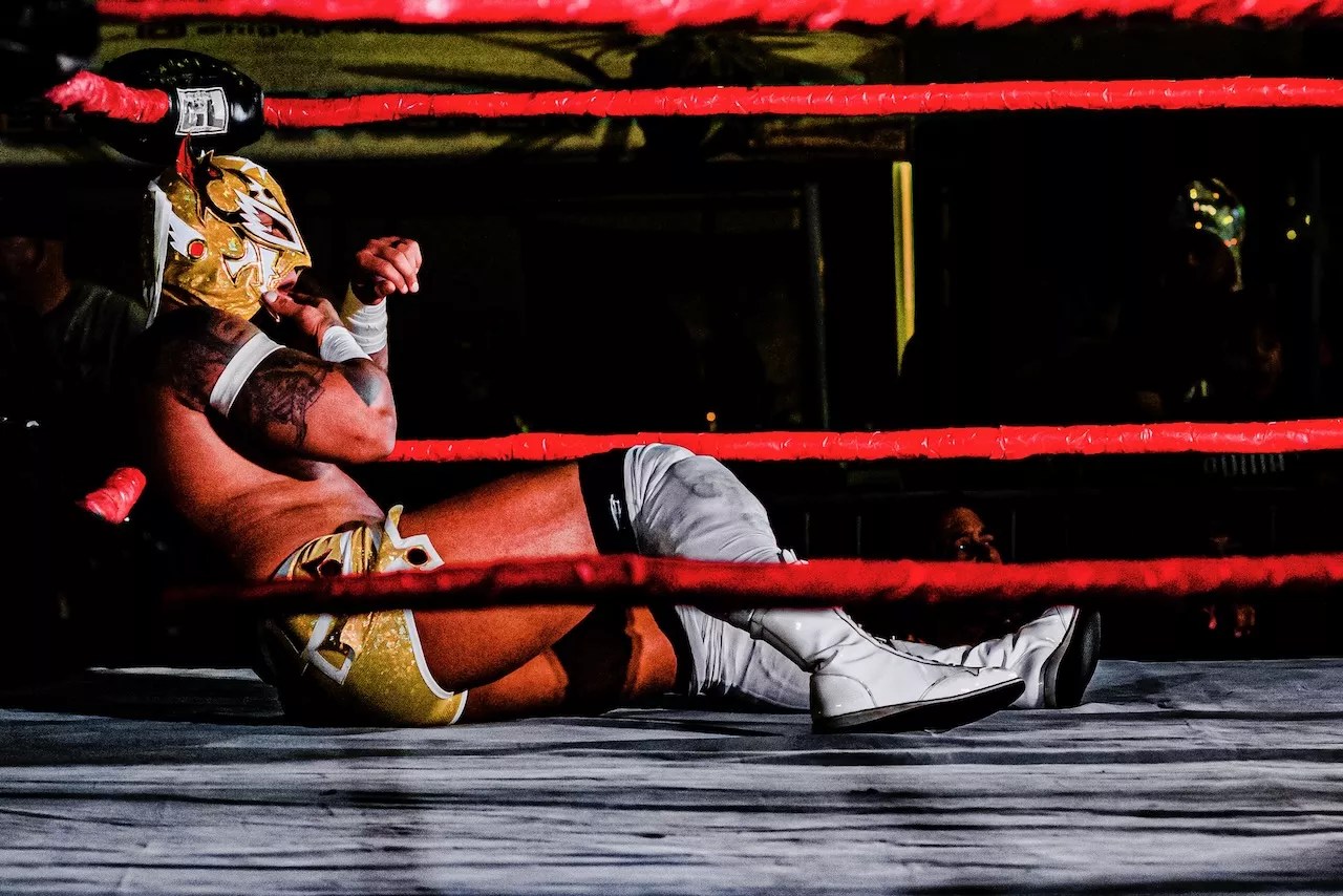 A wrestler checks his jaw while sitting against the ropes during the third wrestling match.
