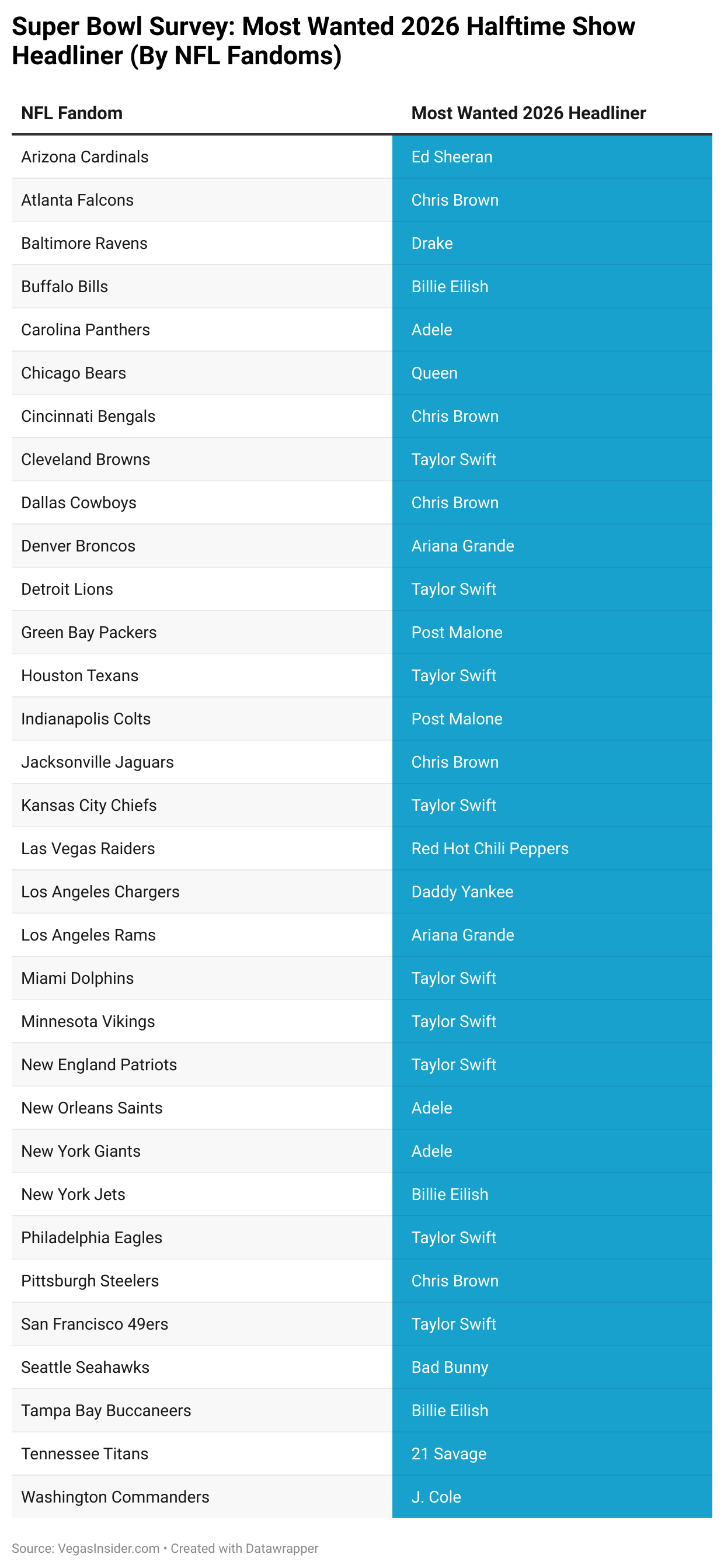 An infographic for preferred Super Bowl 2026 halftime performers (by NFL fandom).