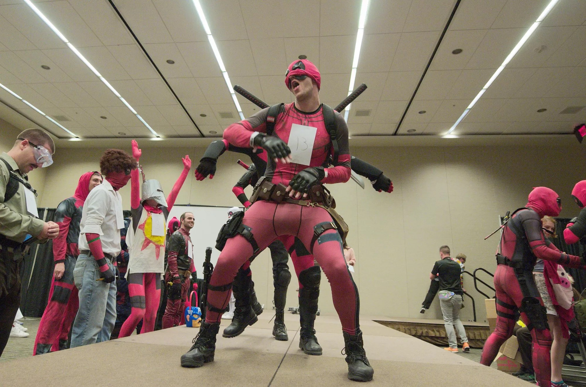 A Deadpool cosplayer shakes his groove thang at Phoenix Comic Fest’s Deadpool Beauty and Talent Pageant.