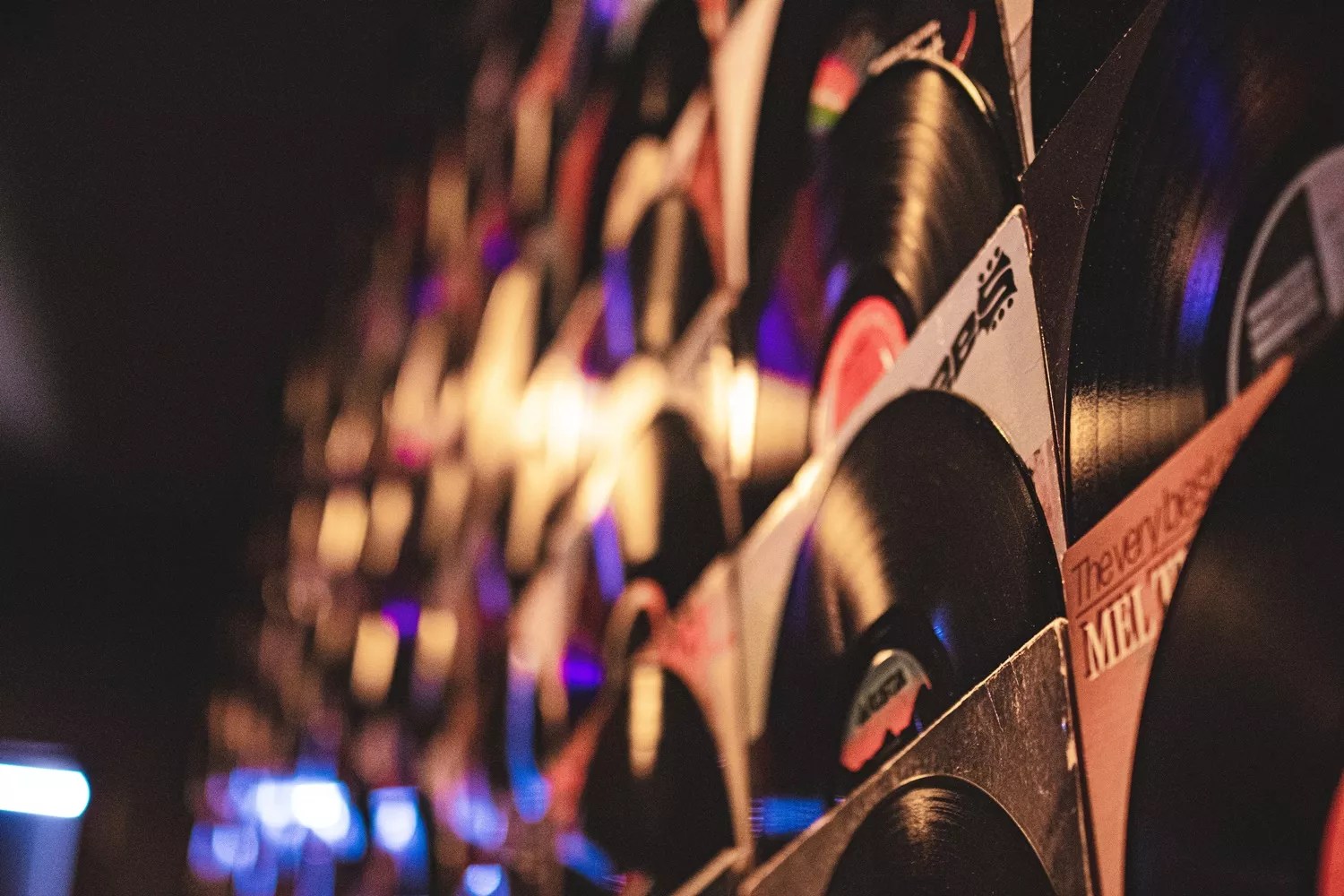 A wall collage of more than 150 record albums inside Chars LIVE.