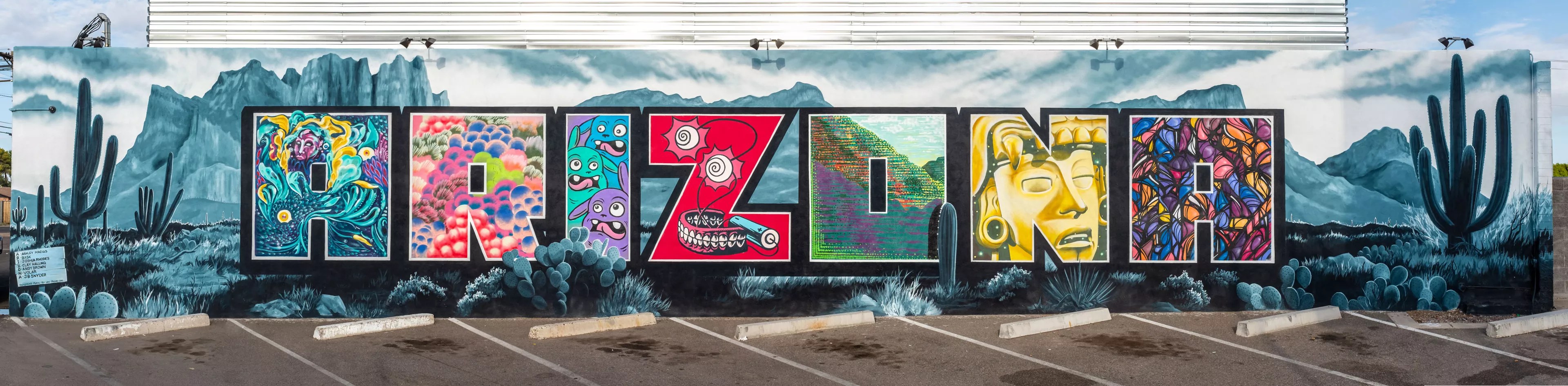 The 50-foot ARIZONA mural is a collaboration between eight artists from the 48th state. The background and each letter feature the artist’s signature style. Tucson-based Joe Pagac, who also painted the mural on the wall of Alamo Drafthouse Cinema in Tempe, painted the Superstition Mountains in the background. The other artists had the freedom to paint whatever they wanted inside the confines of their letter.