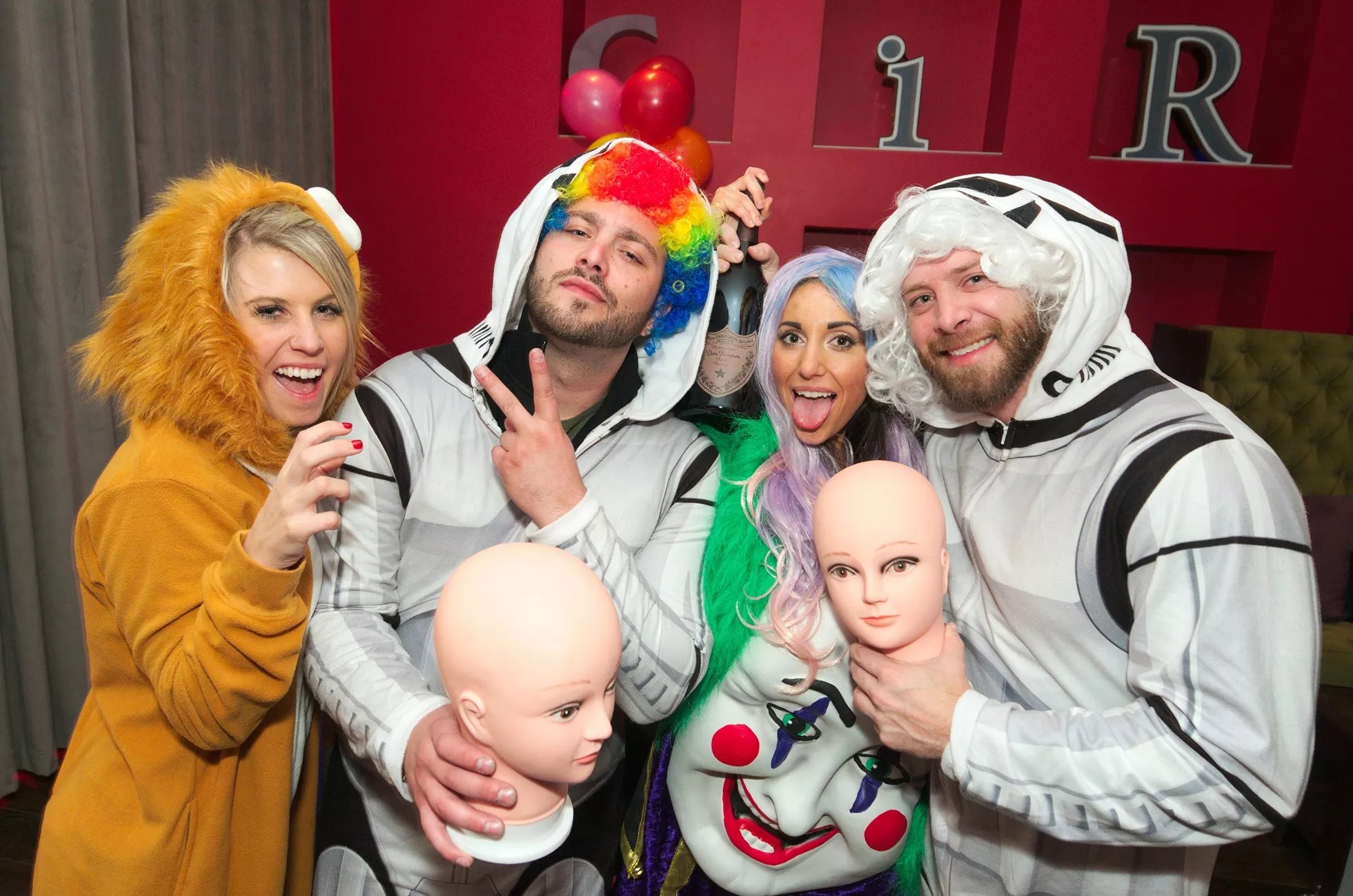 A stilt-walker dressed as a ringmaster stomps around the dance floor while a pair of go-go girls dressed in fanciful outfits dance on the bar and costumed characters roam the club.
