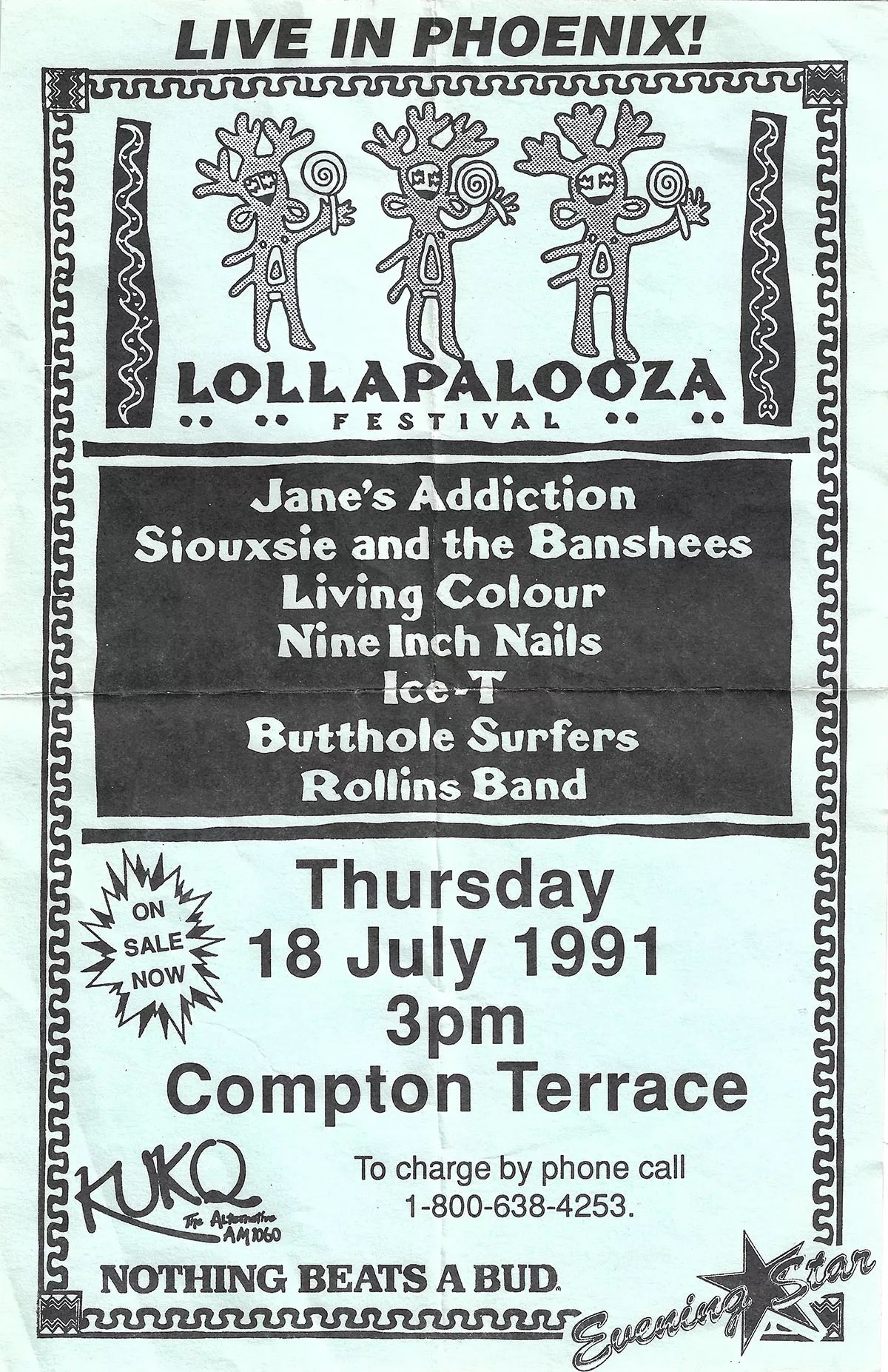 Born from a desire to do “something amazing” with what was ostensibly Jane’s Addiction’s farewell tour (the band was on the verge of its first breakup), Lollapalooza was an ambitious blend of counterculture, activism, and music. Headlined by Jane’s Addiction, the lineup was eclectic and drew from multiple genres: industrial rockers Nine Inch Nails, Ice-T’s thrash-metal act Body Count, post-punk band Siouxsie and the Banshees, funk-metal group Living Colour, Henry Rollins’ hard-rock crew, and psychedelic noise-rock misfits Butthole Surfers. And it would all debut in Phoenix.