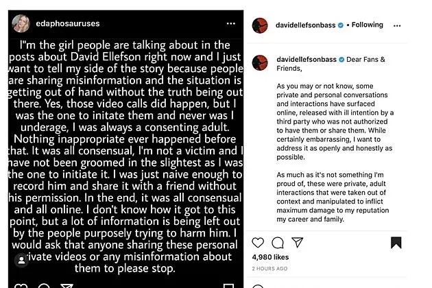 Ellefson shared a statement on his Instagram earlier this month from the woman claiming to be the recipient of explicit videos he was pictured in. His account is now private.