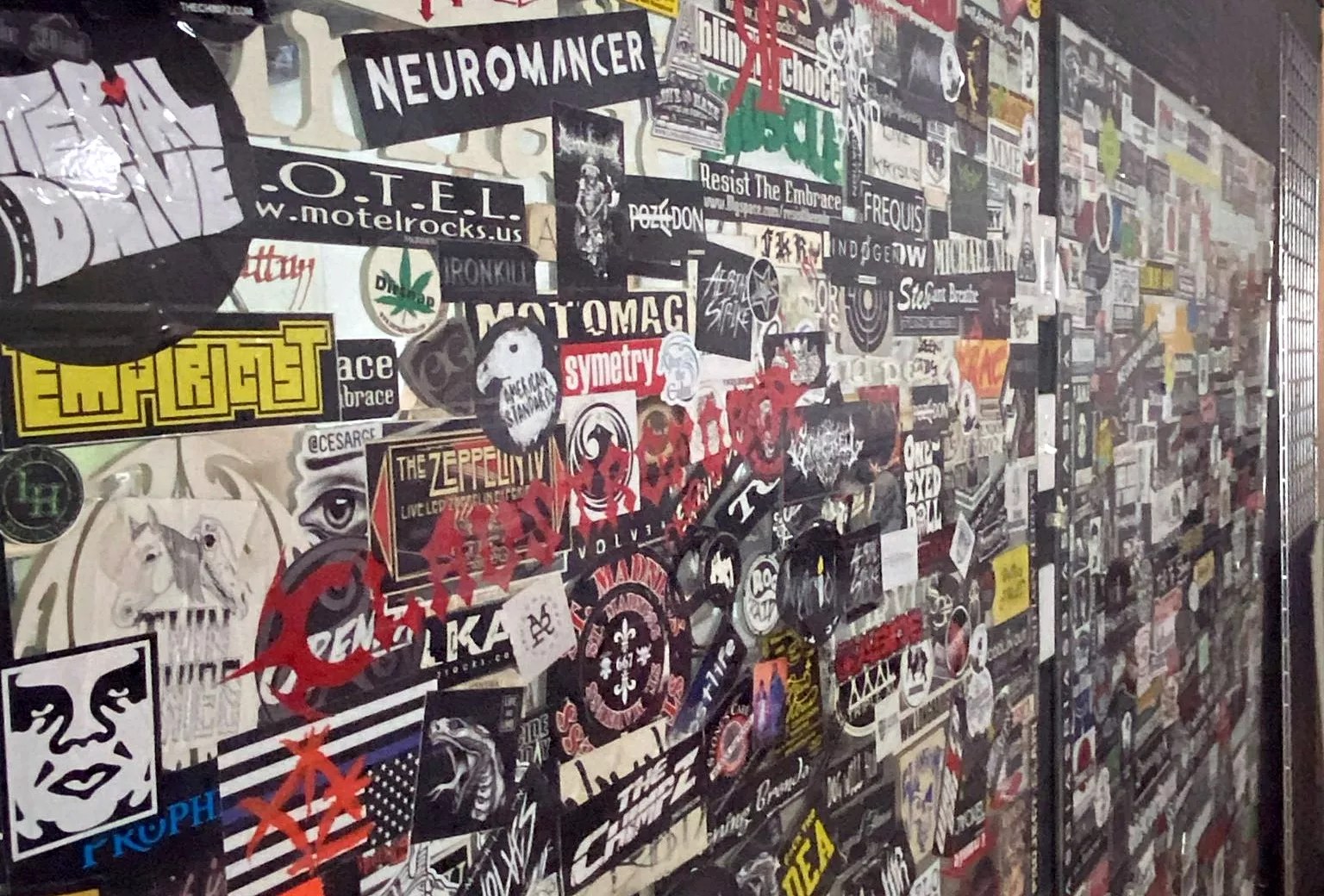 The sticker-covered mirrors from Joe’s Grotto inside Furious Brewing Company.