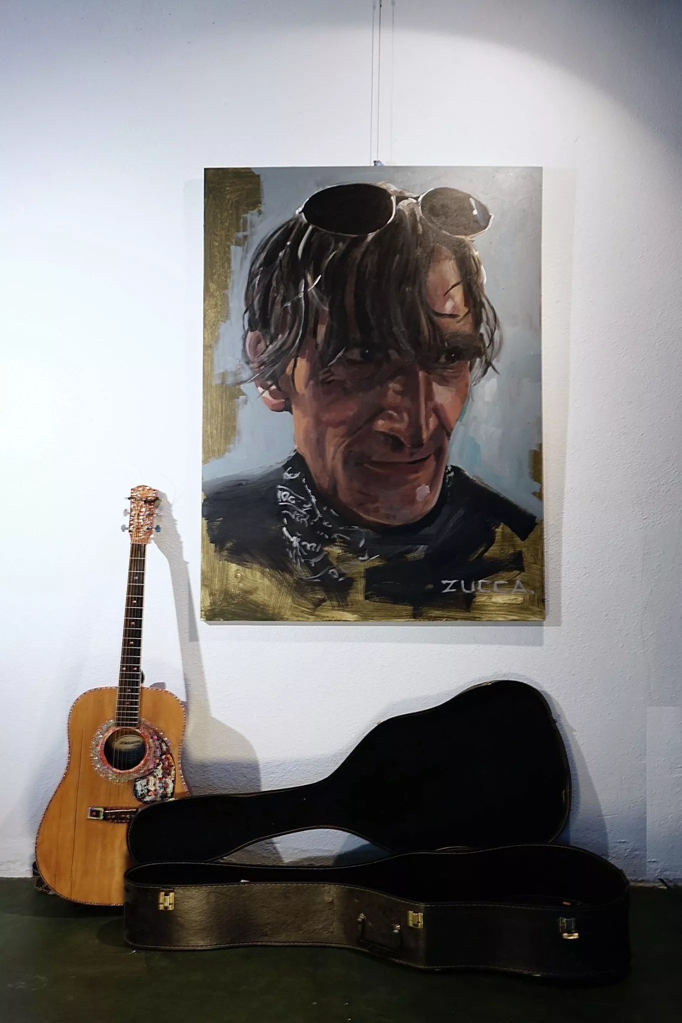 Tom’s guitar and case, with portrait by Abe Zucca.