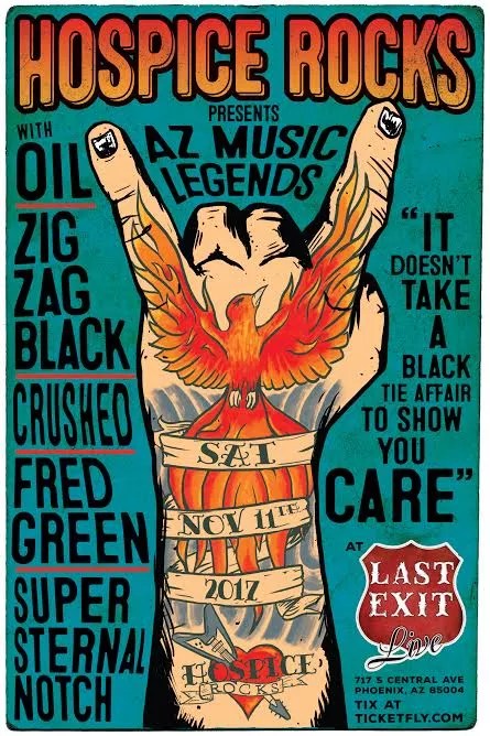 On Saturday, November 11, Hospice Rocks will stage its first benefit since 2006, an “AZ Music Legends” show at Last Exit Live in downtown Phoenix featuring many of the bands that played shows during Hospice Rocks’ original run like Zig Zag Black, Oil, Crushed, Super Sternal Notch, and Fred Green.