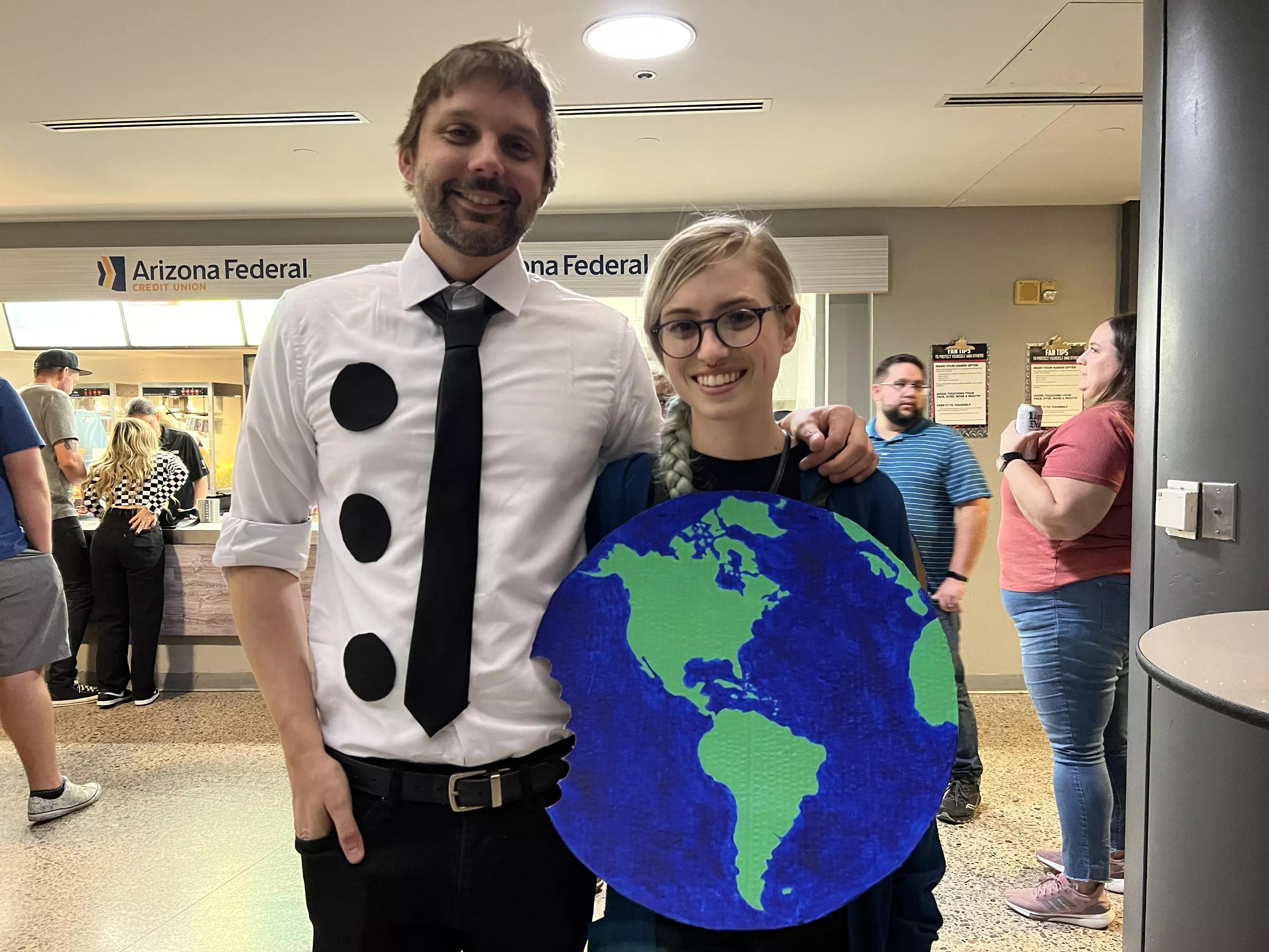This couple came to the show dressed as Three-Hole Punch Jim from The Office and a globe with a bite out of it. Get it? Jimmy Eat World.