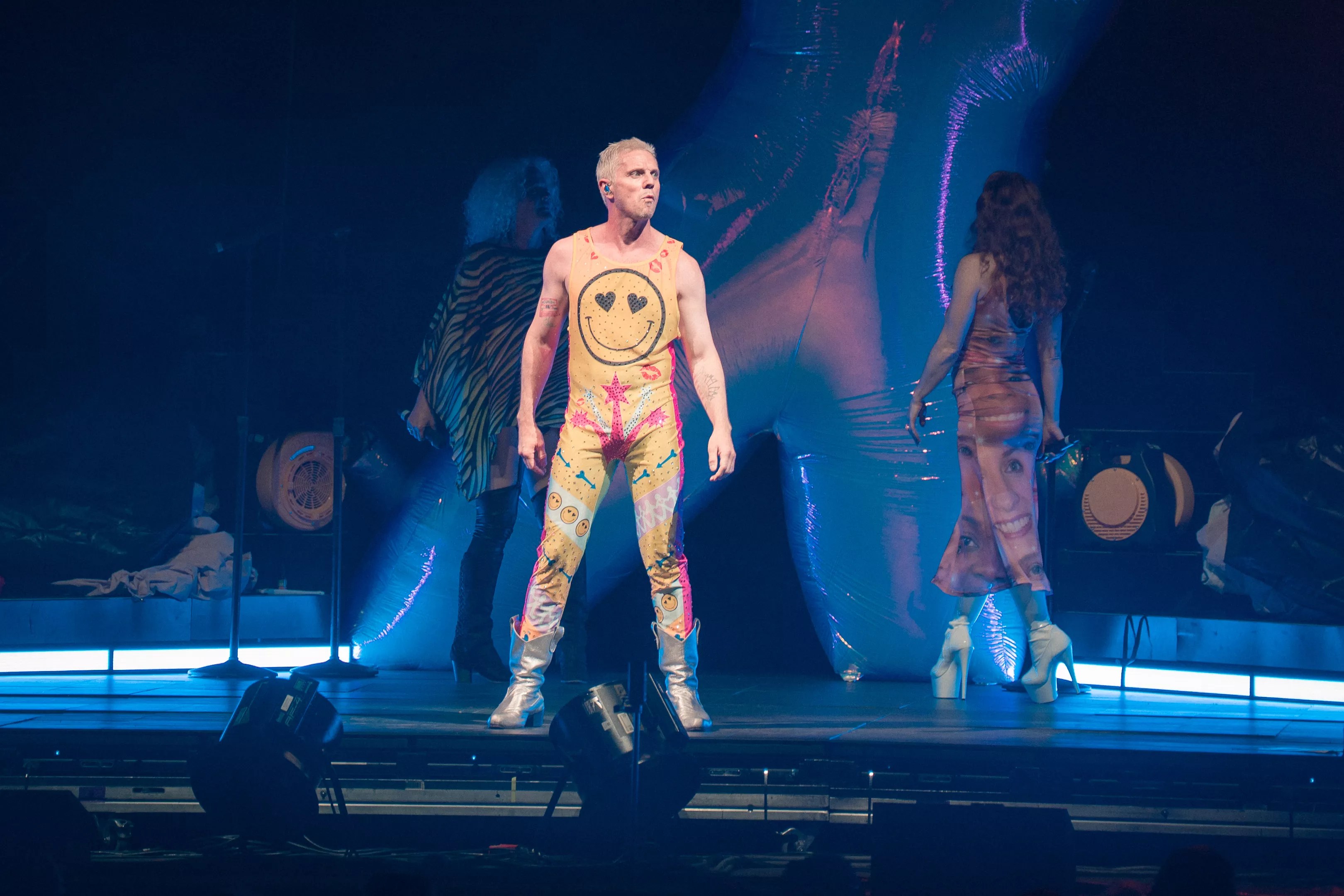 The group took to the stage with their groovy track, “Laura.” Each member had a unique energy and look. Bridget Barkan is particularly magnetic as the tour’s replacement for the original fierce redheaded Ana Tronic. She’s a combination of big red hair, graceful and sensual flowing dancing moves in her dress and platform latex boots and boisterous sexual expression. Lead singer Shears and another new touring member, Amber Martin, also stood out with him in a jumpsuit covered in graphic hearts and smiley faces, and her in a zebra-print dress and thong.