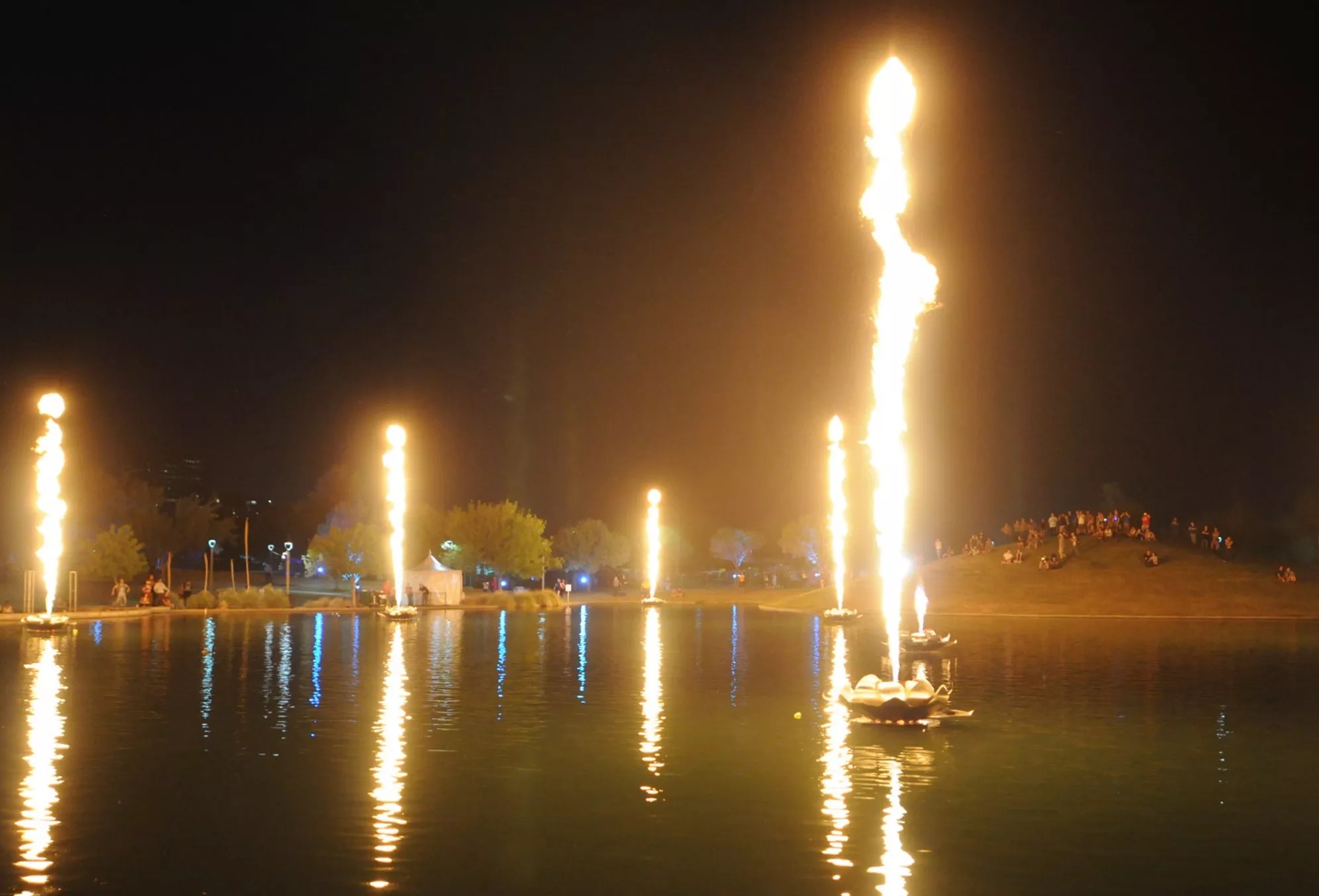 One of the more impressive sights to be seen at Lost Lake didn’t take place on any of its stages. Instead, it happened on the massive pond in the center of Steele Indian School Park, which was lit up in spectacular fashion during various pyrotechnic displays.