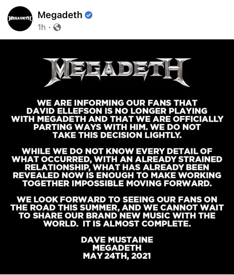 “We are informing our fans that David Ellefson is no longer playing with Megadeth and that we are officially parting ways with him,” the band’s statement on social media reads. “We do not take this decision lightly.
