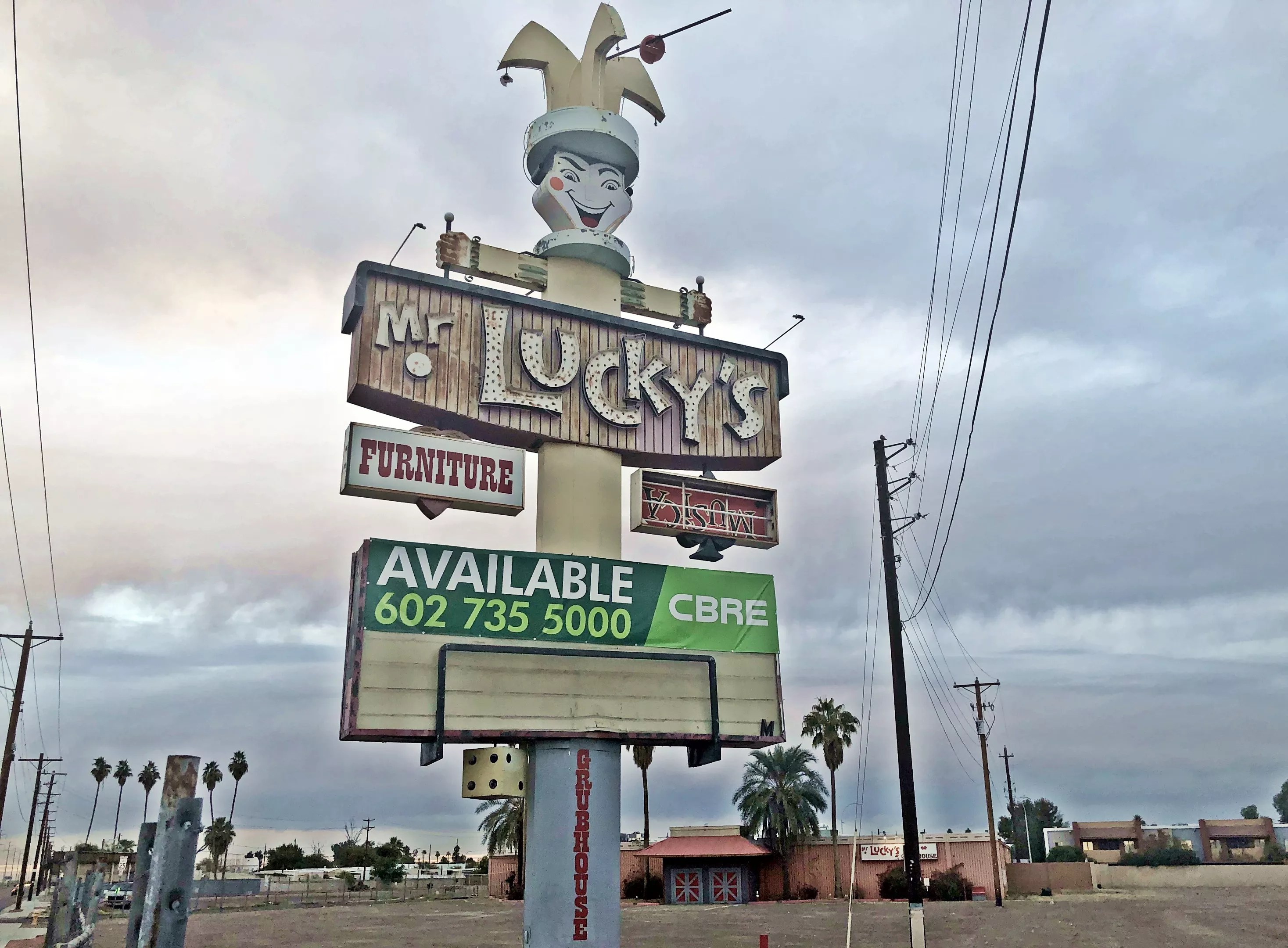 Designed by Glen Guyette, an artist who created signs for several other defunct local businesses like My Florist Cafe, it’s a unique throwback to another era in Phoenix history. Both Mr. Lucky’s and that sign have seen better days. (LoopNet estimates that improvements to the property are in excess of $500,000.)