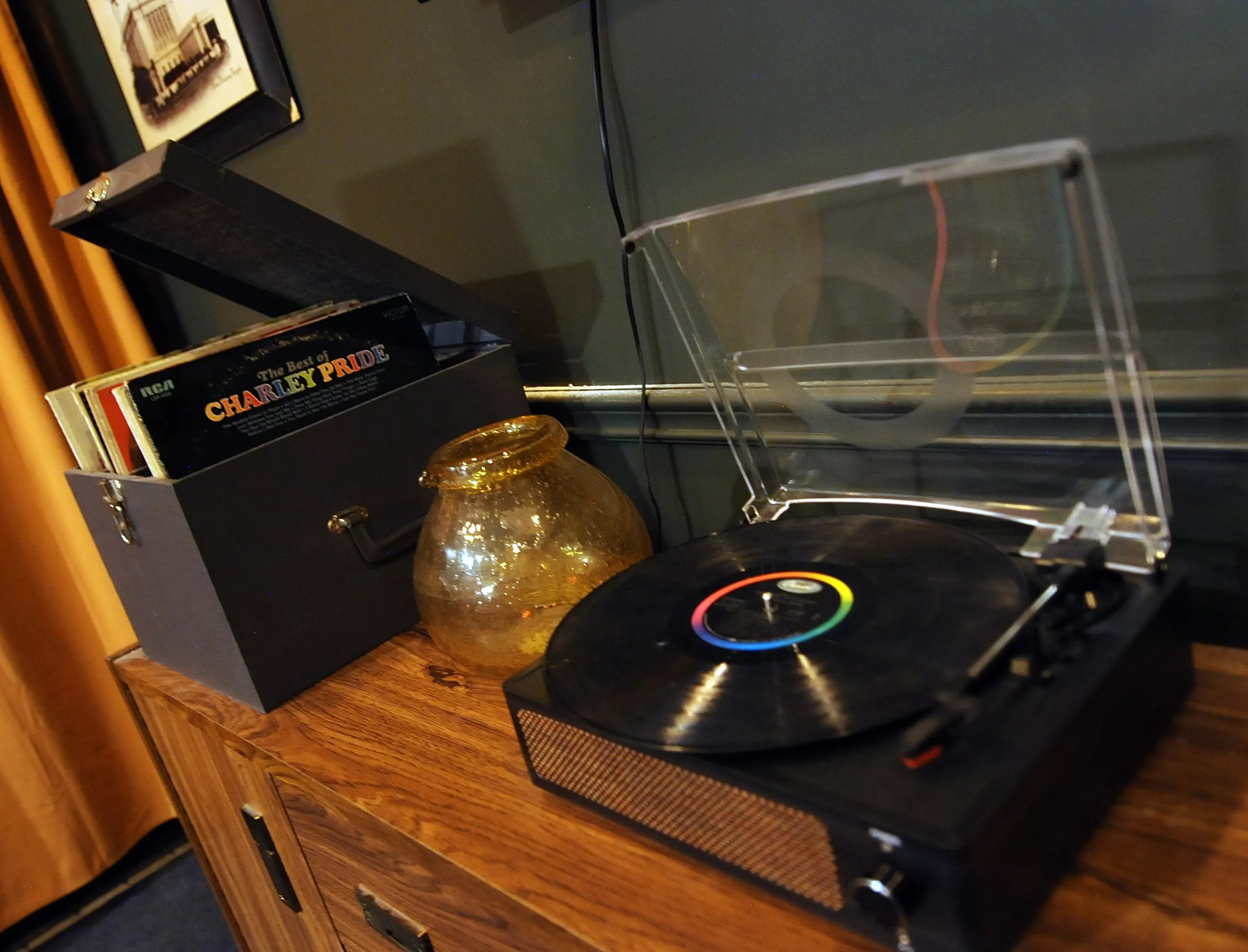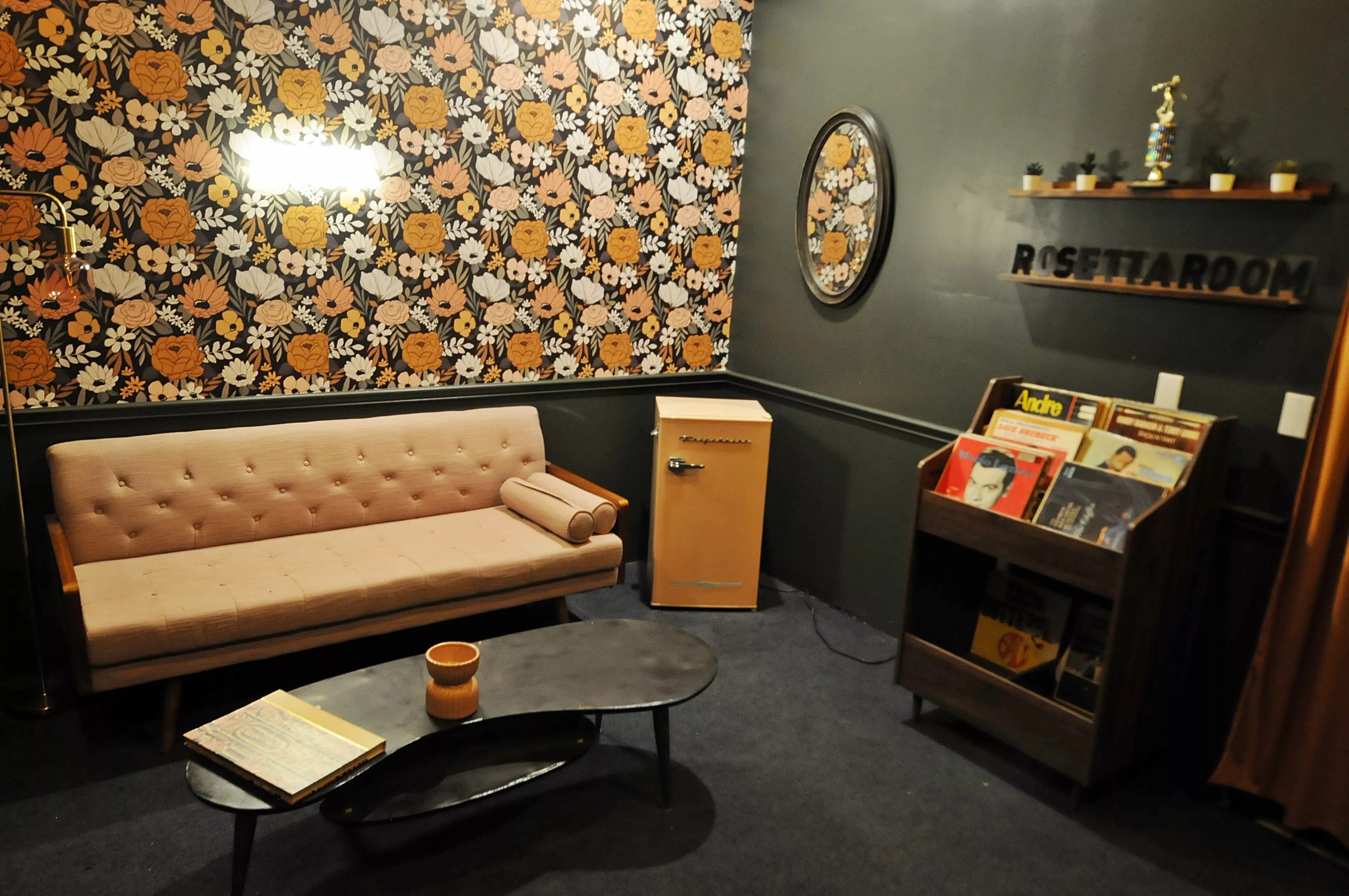 A glimpse inside the larger of The Rosetta Room’s two different green rooms, which features retro vibes, a turntable and a selection of dozens of vintage records.