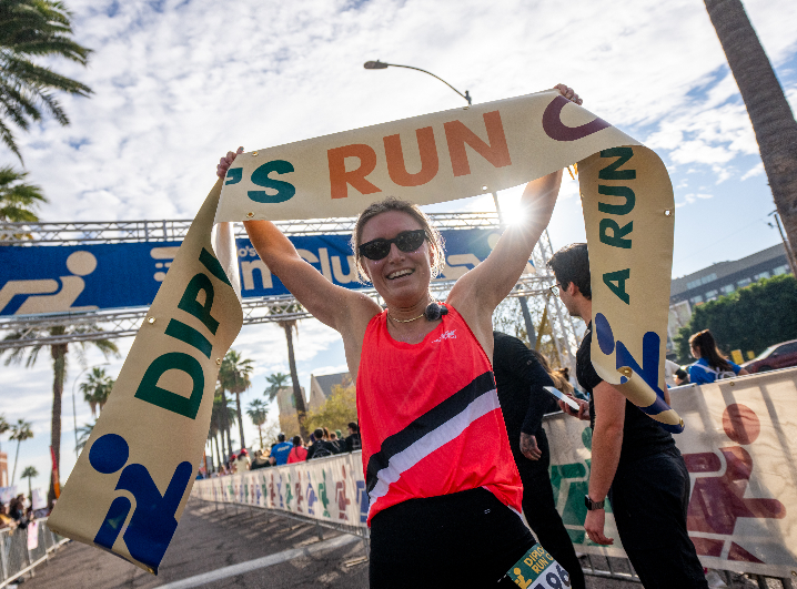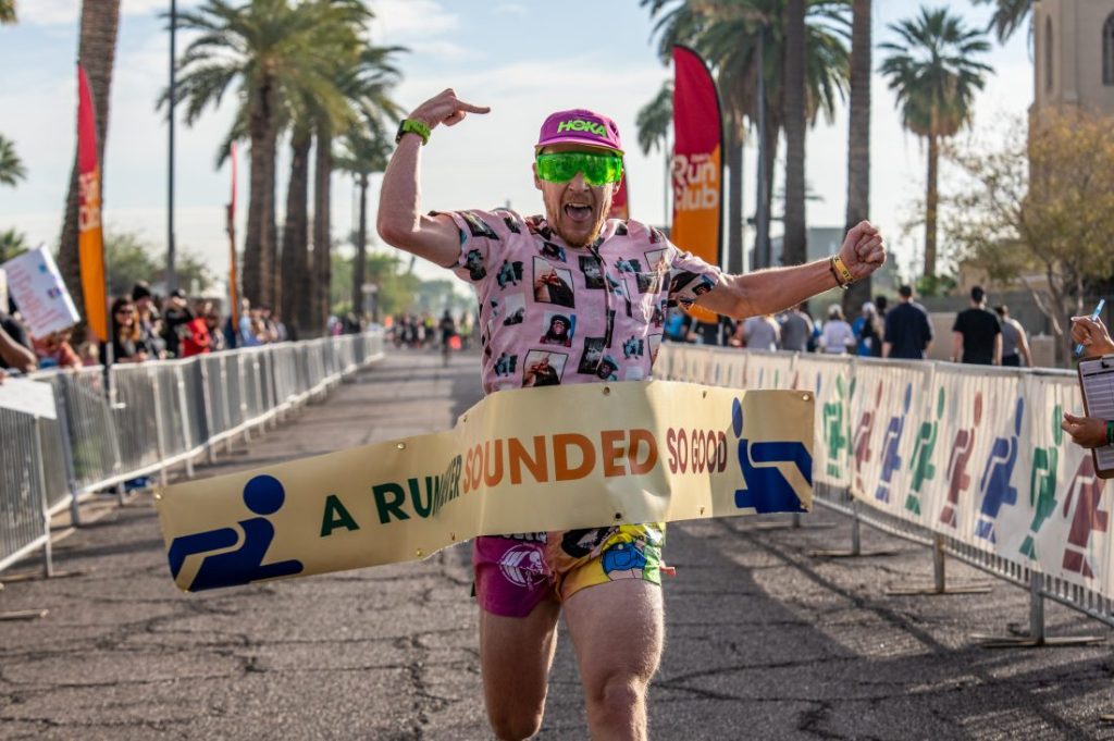 Ultrarunner Tara Dower crossing the line at Diplo’s Run Club event in downtown Phoenix.