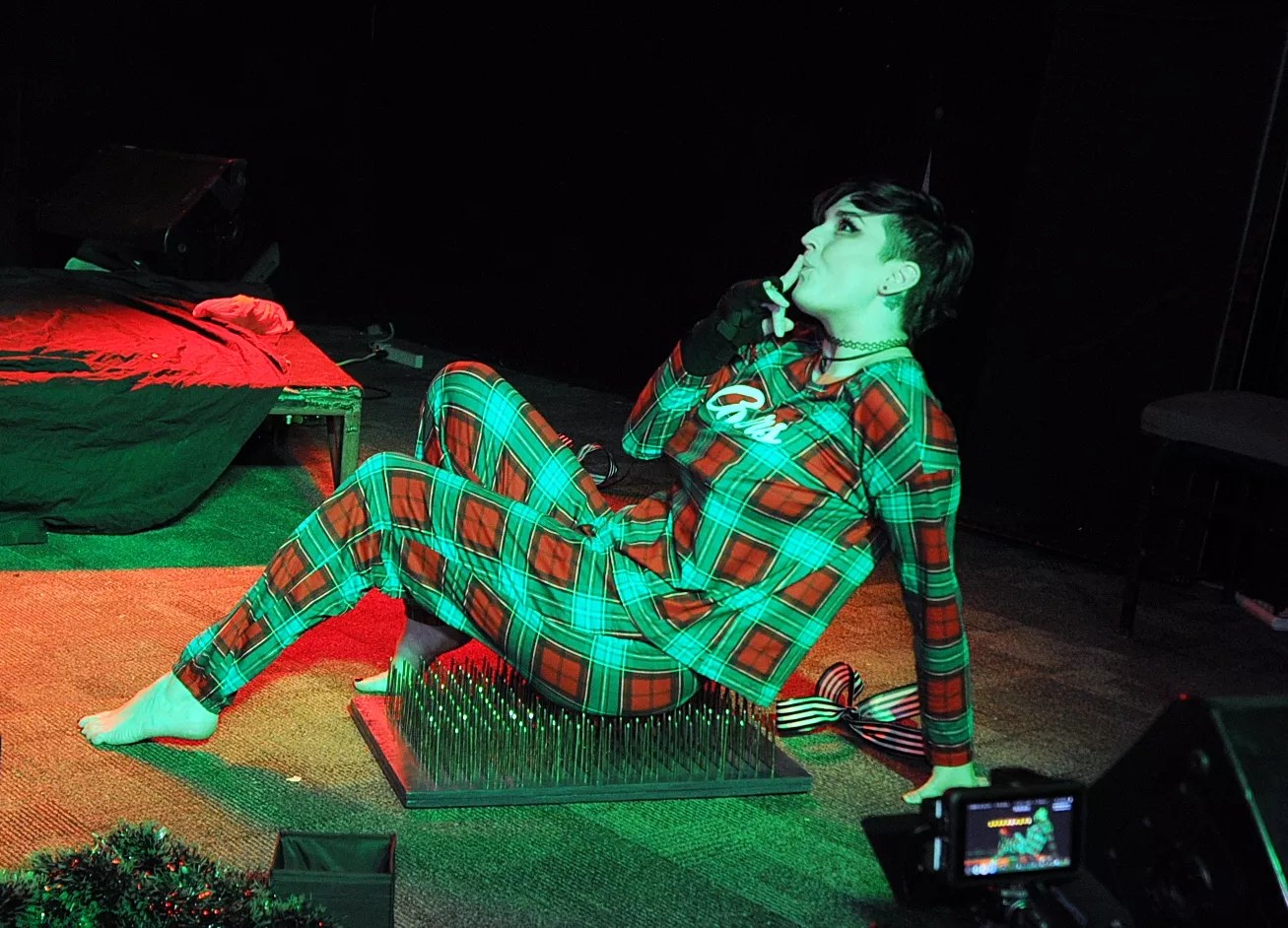 Irene Silver becomes a sexy Christmas tree atop a bed of nails while performing a stack act with Britini Bloodshed (who is lying on broken glass).