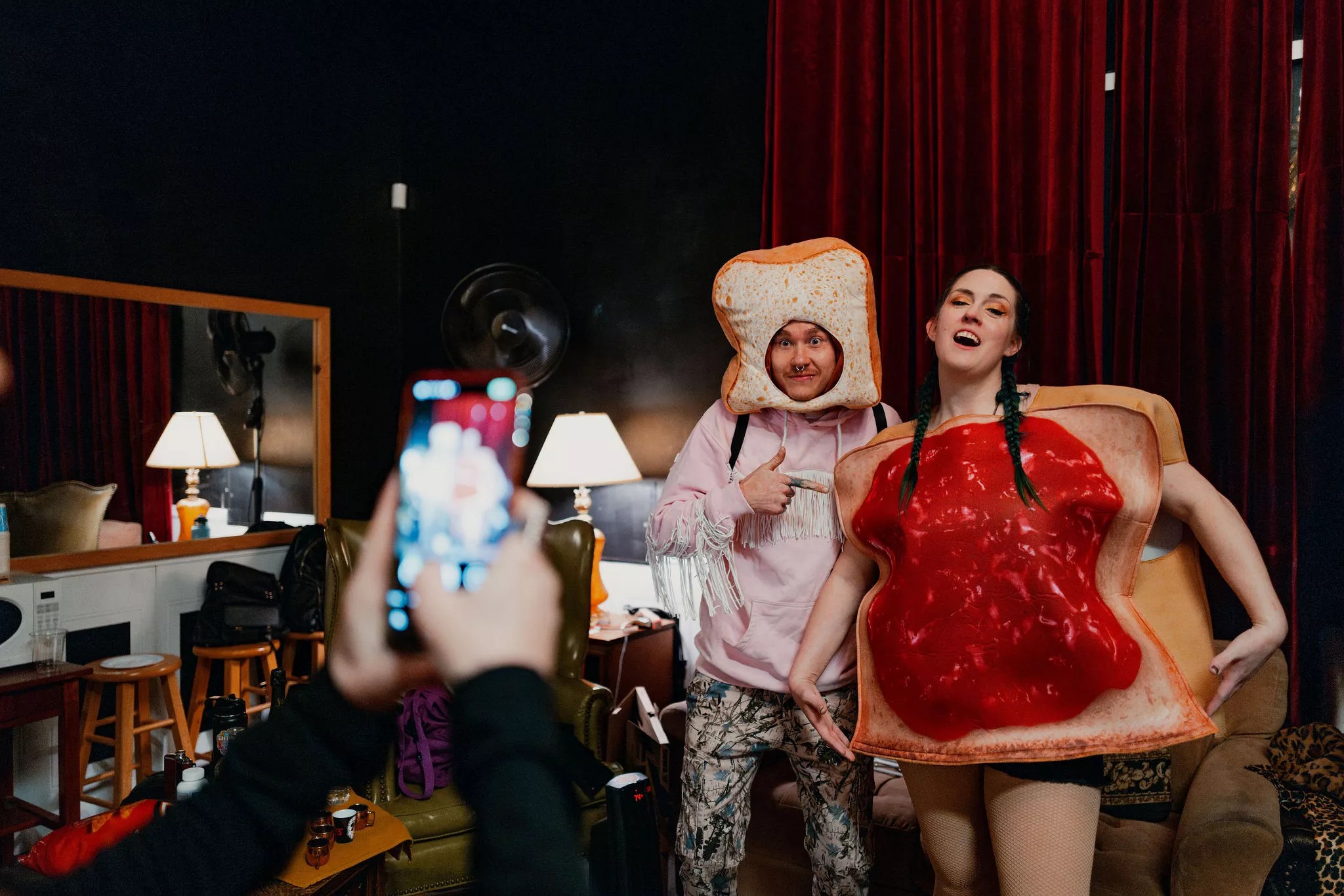 Members of A Casual Divorce (Rachel Bachman) and Snailmate (Bentley Monet) in the green room prepping their sets.