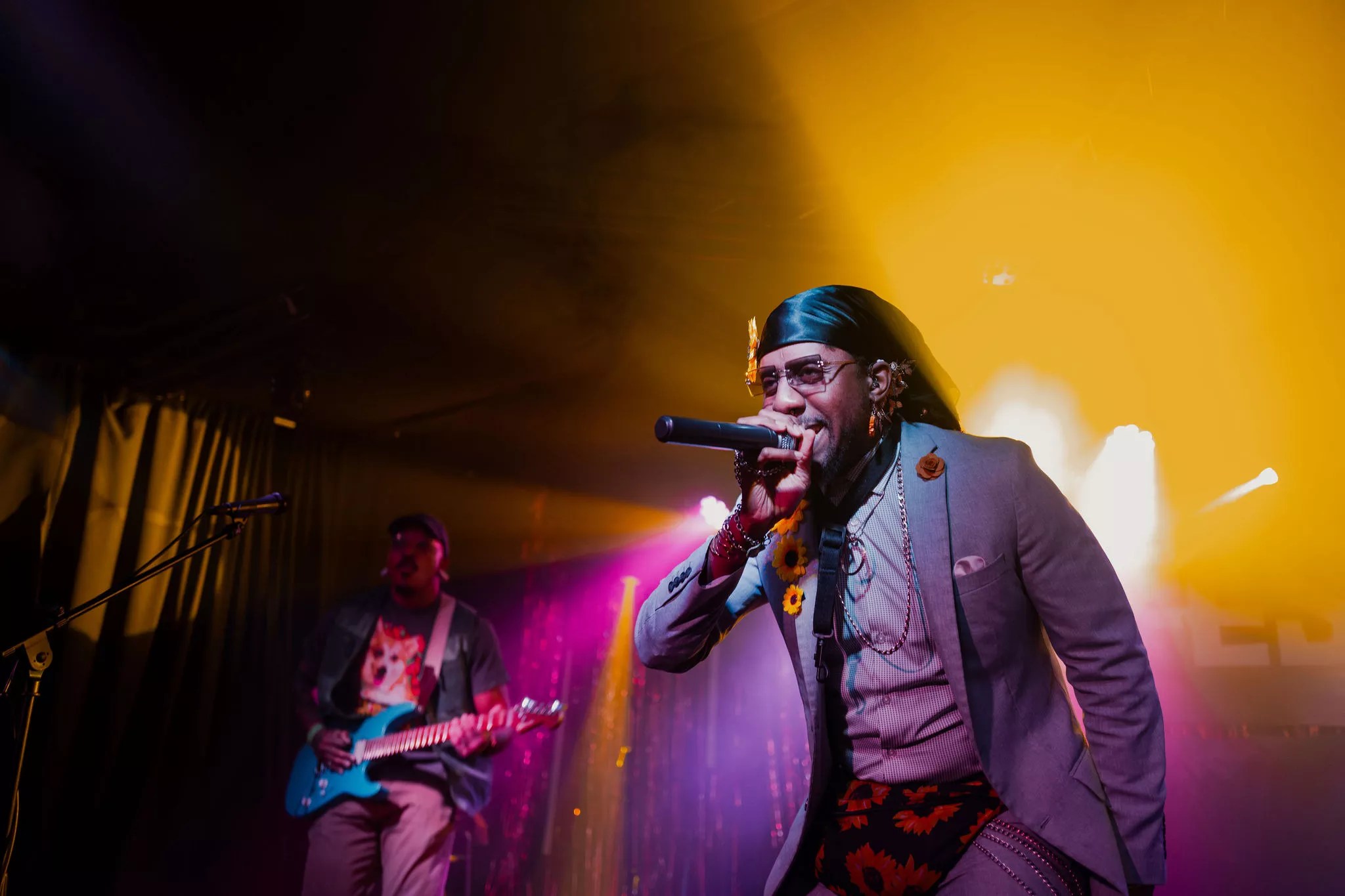 An action shot of The Color 8 Band (Ashton Vaugn Charles), the Sun Flower King.