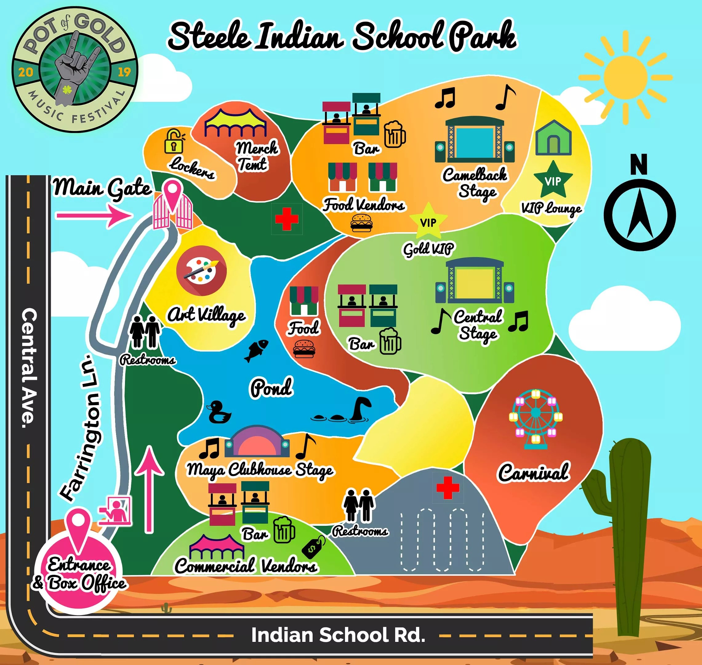 When and where is the festival? Pot of Gold Music Festival 2019 runs from Friday, March 15, to Sunday, March 17, at Steele Indian School Park, 300 East Indian School Road. Gates open at 3 p.m. on Friday and at 3 p.m. on Saturday and Sunday. The festival wraps up at 11 p.m. each night.