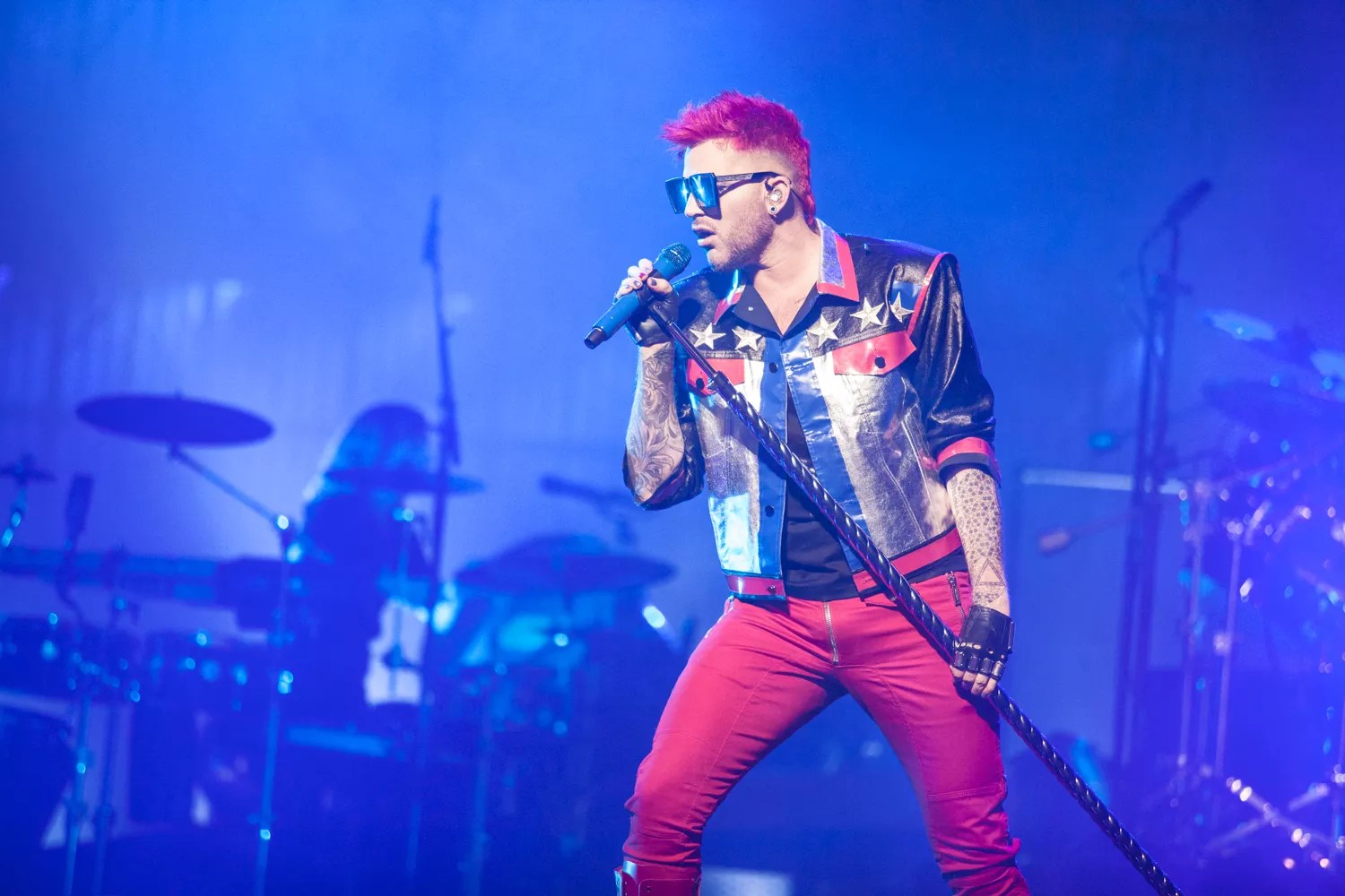 Adam Lambert shouts this with cheeky glee as the band finishes playing “Fat Bottom Girls.” His hair dyed Kool-Aid red, he’s wearing a getup that looks like a mashup of Faith-era George Michael and Bono from the Zoo TV tour – huge shades, big earrings, fingerless gloves, and an American flag vest. It’s the first of many ensembles he’d wear throughout the evening. The cherry-headed singer had more costume changes than a Broadway star.