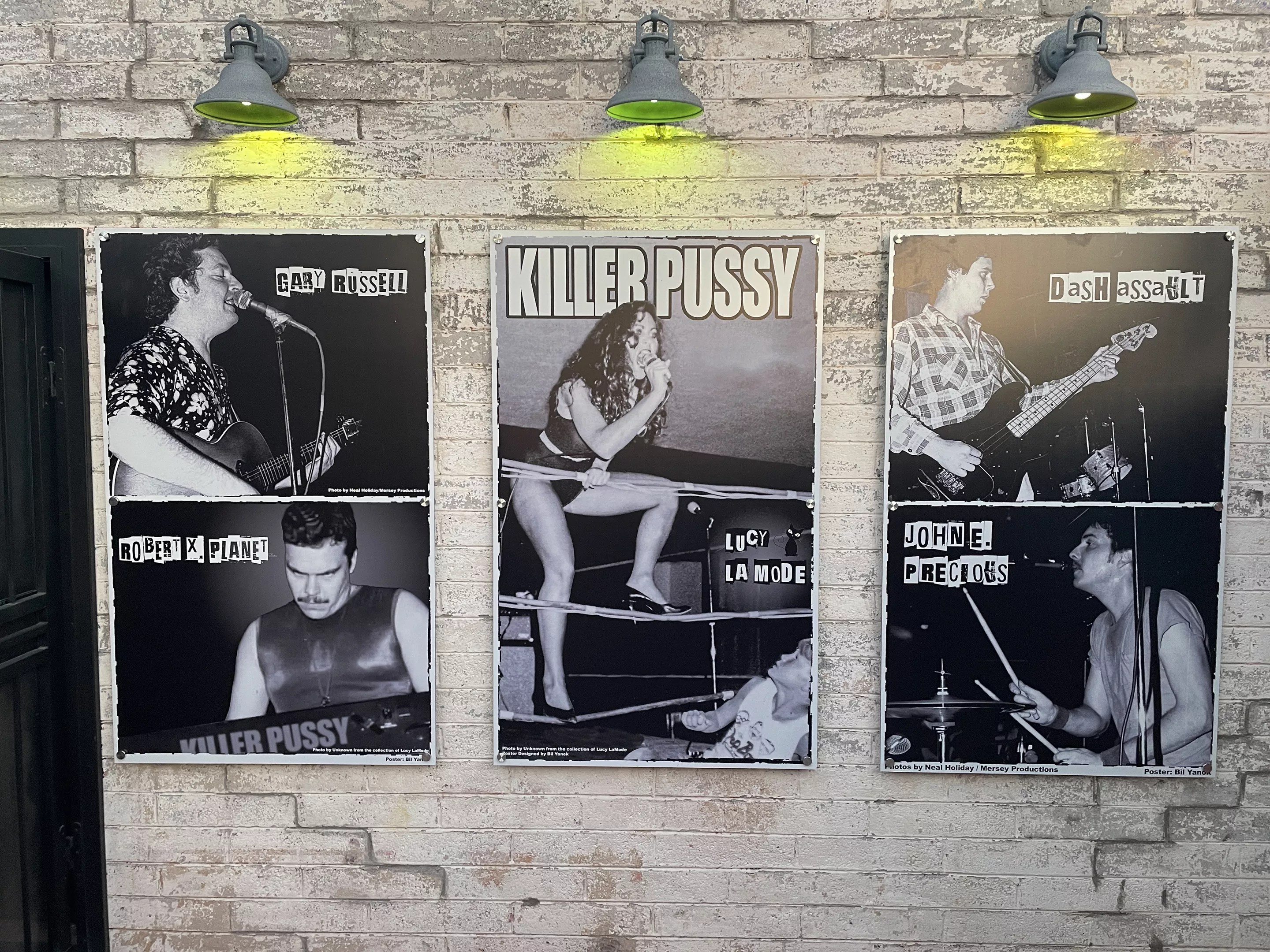 Posters of Killer Pussy’s members — including Robert X. Planet, lower left — during a celebration of the band’s history at Club Placebo in 2023.