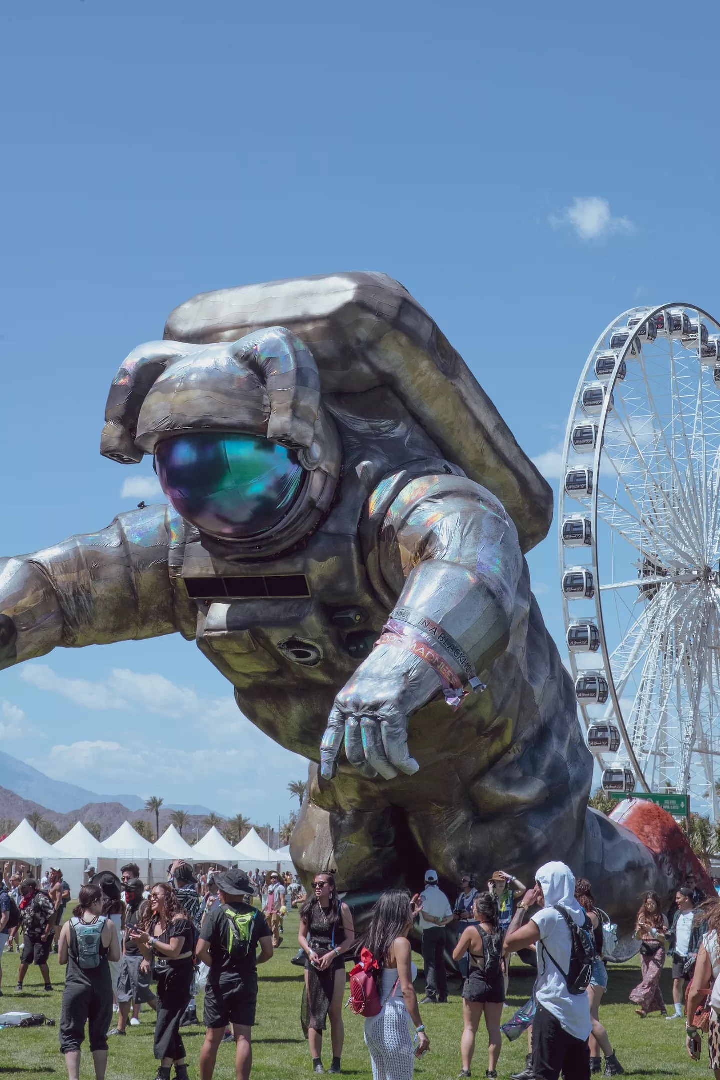 Horse cops patrol the grounds and keep the masses in check as they wait for gates to open. Then it’s a mad dash for the merch line before it reaches Space Mountain levels of “Hell, no.” Then, after the weight of timing and anticipation lifts, the atmosphere is pure, chaotic joy. Taking pictures with the spaceman as it is dragged around the festival grounds all day. Yelling at your friends to try and understand each other over the bleeding bass from the Sahara stage.