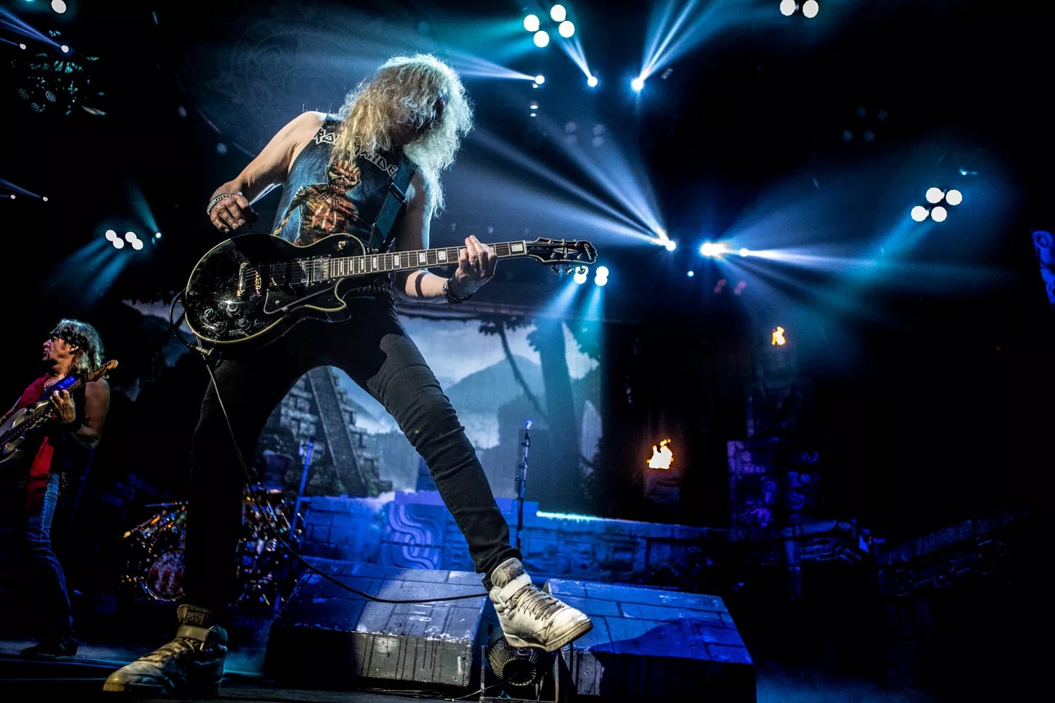 Dickinson, who looks more like MacGyver on steroids than a classic metal dude, was as responsible for keeping the show’s energy up as the wall of guitars and thundering drums. His voice was none the worse for age. He belted it out full force as he ran non-stop around that faux temple, delivering fan favorites like “Children of the Damned” and, of course, “Iron Maiden.”