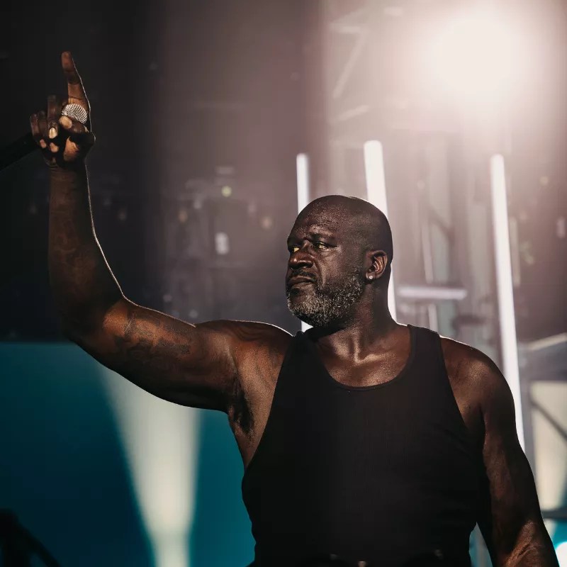 For the final single-digit seconds of Diesel’s countdown, the crowd chants along with the changing red numerals. The screens were then filled with clips from O’Neal’s basketball career set to bombastic choral-orchestral music similar to the “O Fortuna” opening movement of “Carmina Burana,” the kind of thing often used to cue the audience to feel awe during a movie trailer. A drone with blinking lights began circling and swooping at low altitudes where Shaq was expected to enter. The crowd was by then so dense that, despite the famously large stature of the man awaited, most could not make him out until he had climbed the central stage with entourage preceding and following, filming his every move and gesture. Even way back by the trash cans and tiny ADA zone, even when the mass of attendees and enormous scale of audiovisual equipment and stage make judging distances a dubious business, there was no mistaking the tall bald man in the black tank top with a line of grey grizzle along his jaw as he approached the DJ console. Diesel had arrived.